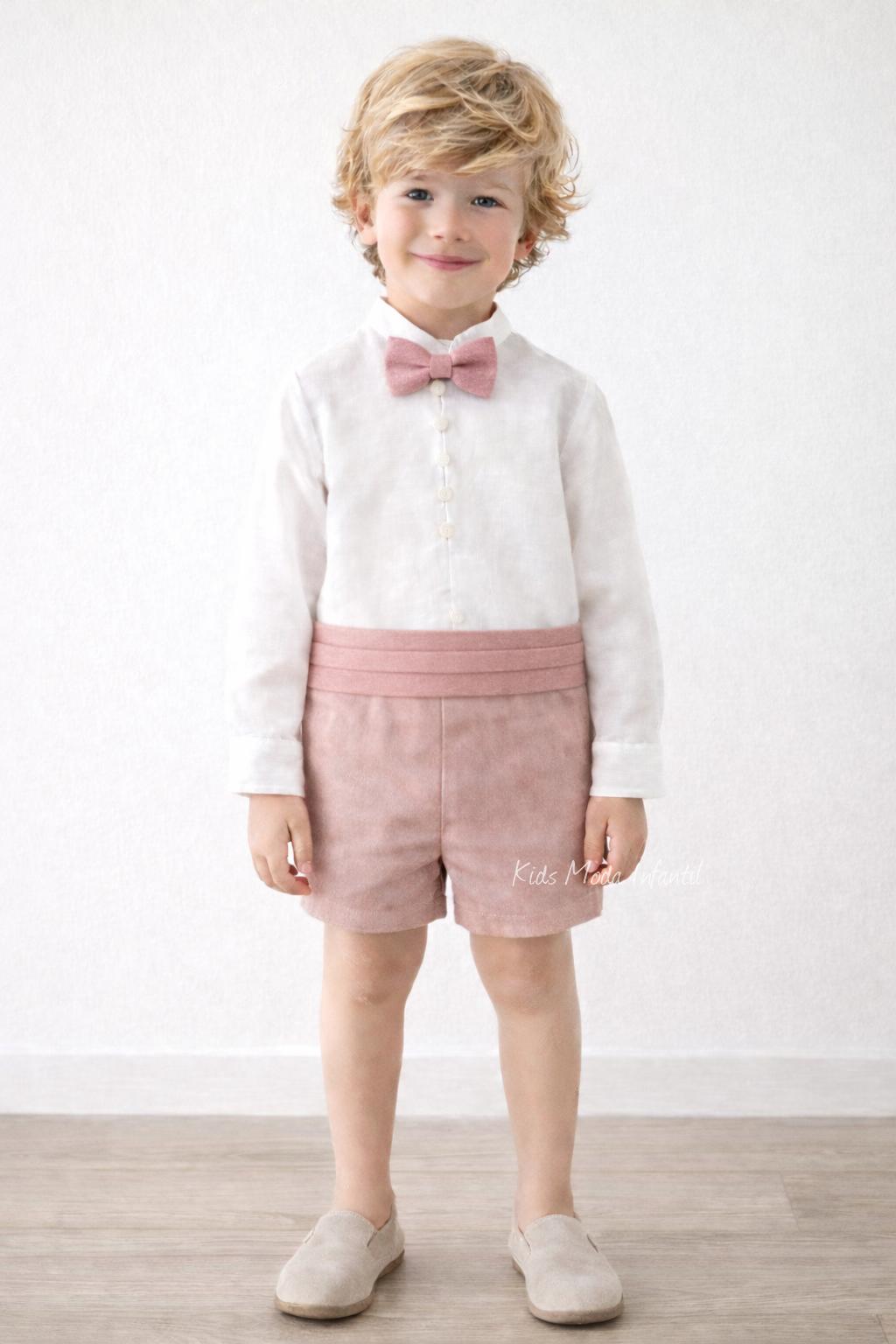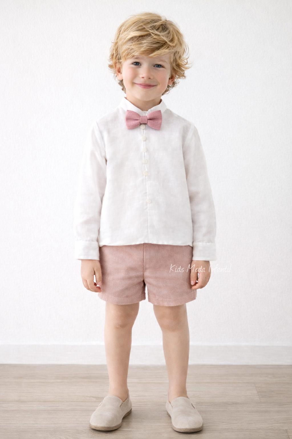 Conjunto ceremonia bebe o conjunto arras de bebe en un estilo elegante e ideal, confeccionado y elegido con mucho cuidado para que tu bebe luzca ideal en esos eventos especiales. Este elegante conjunto bebe de vestir, es de dos piezas, compuesto por camisa de manga larga en color blanco roto en tejido lino, con cuello mao y botonadura vista a medio cuerpo; a juego pantalón corto bebe con goma en la parte trasera de tejido lino rosa empolvado. La elegancia de este traje bebe arras es perfecto para combinar con los vestidos de niña ceremonia ideales para eventos especiales de primavera verano.