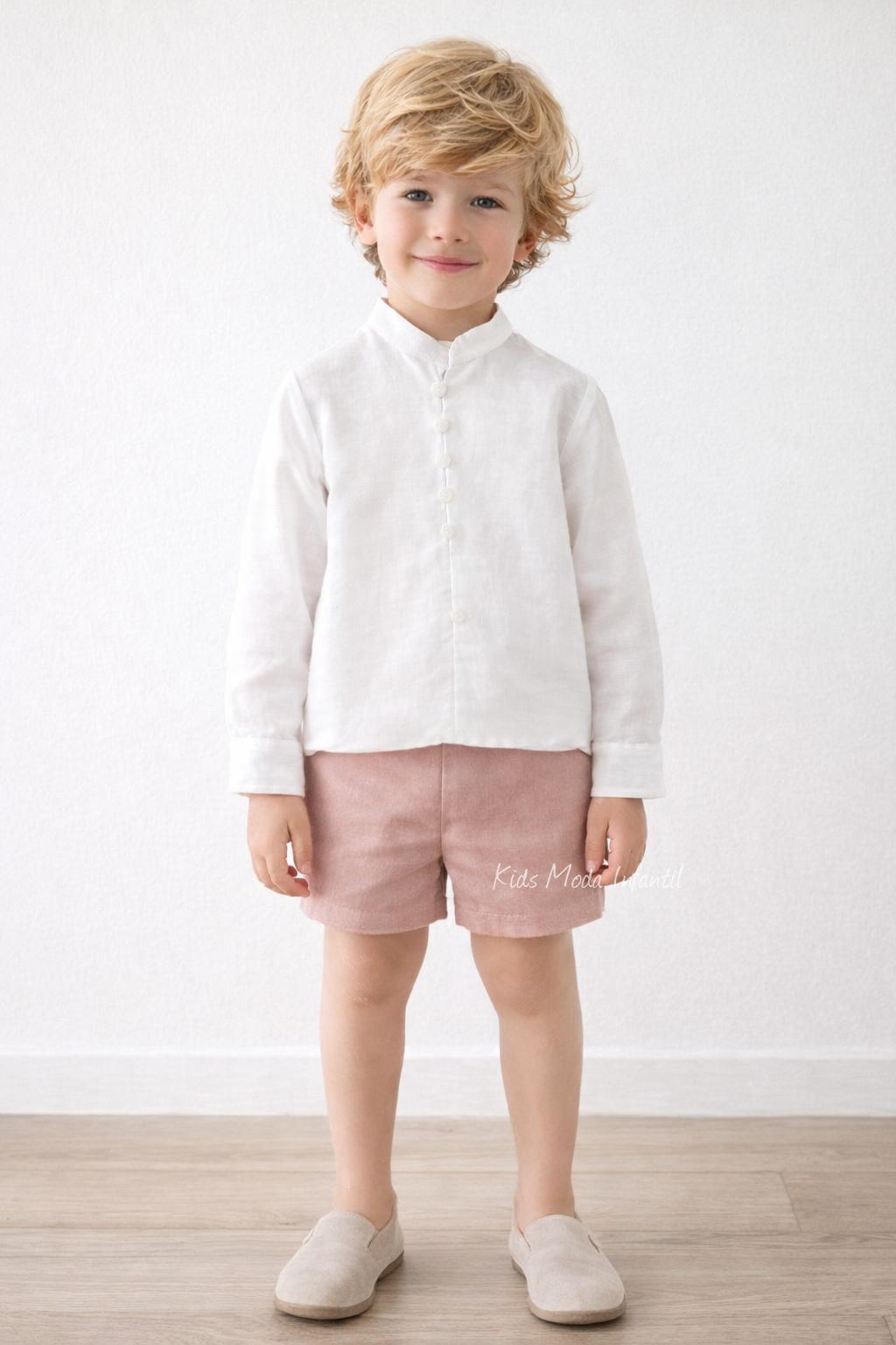 Conjunto ceremonia bebe camisa blanco roto lino y pantalón corto rosa empolvado Eva Martínez Artesanía