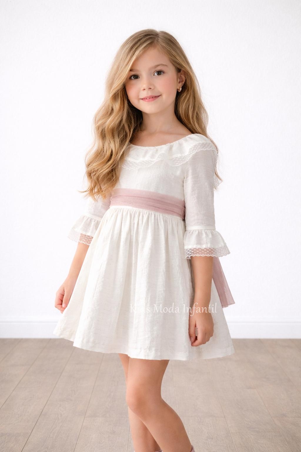 Vestido ceremonia niña beige claro de Basmarti con media manga y fajín de tul rosa empolvado. Elegante, con encaje y lazo trasero, ideal para bodas, arras y eventos especiales.