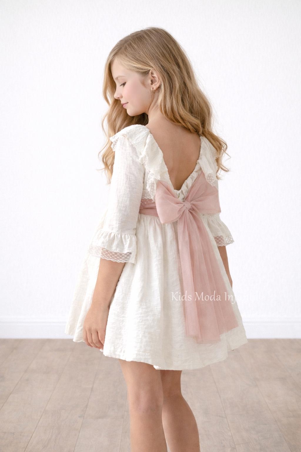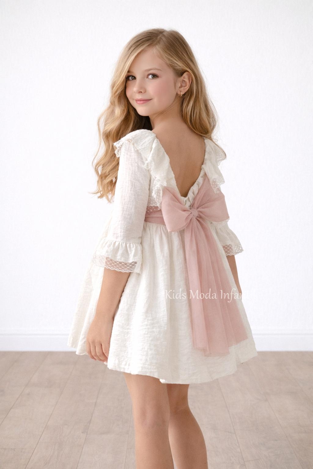 La falda con vuelo, confeccionada en tejido ligero, cae con delicadeza por encima de la rodilla, ofreciendo movimiento y frescura. El conjunto se completa con un precioso fajín de tul en rosa empolvado, que se ajusta a la cintura y termina en un espectacular lazo trasero de gran caída, creando una silueta dulce y elegante.