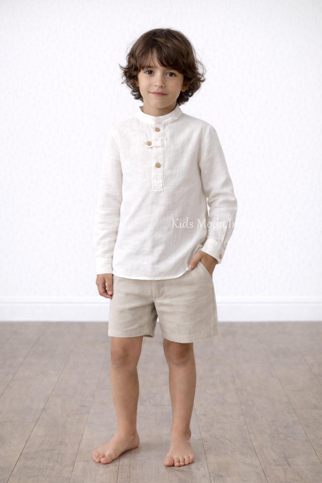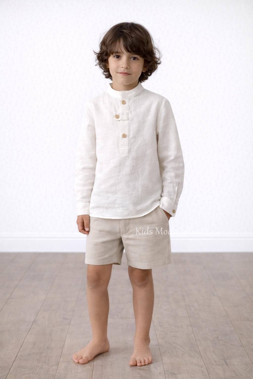 Conjunto ceremonia niño beige lino camisa cuello mao y bermuda Basmarti | Kids Moda Infantil