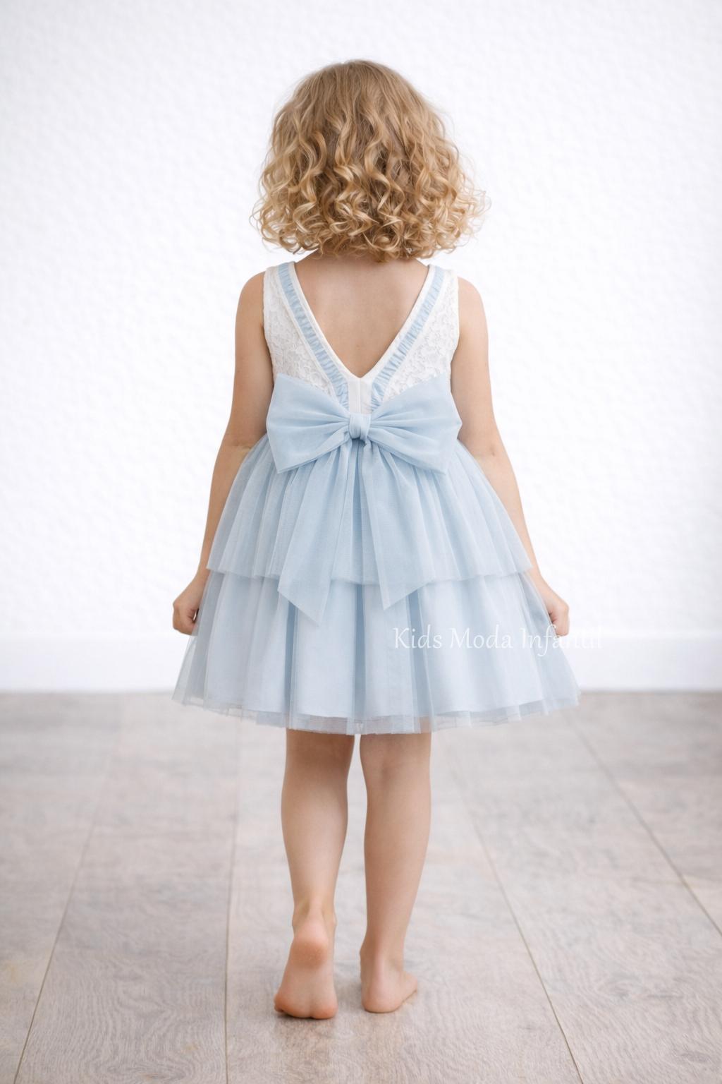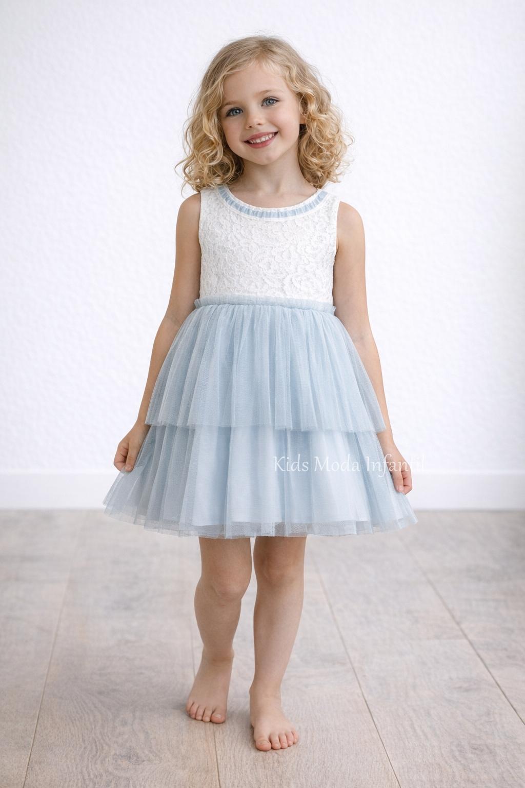 Vestido ceremonia niña encaje blanco y tul azul empolvado Basmarti