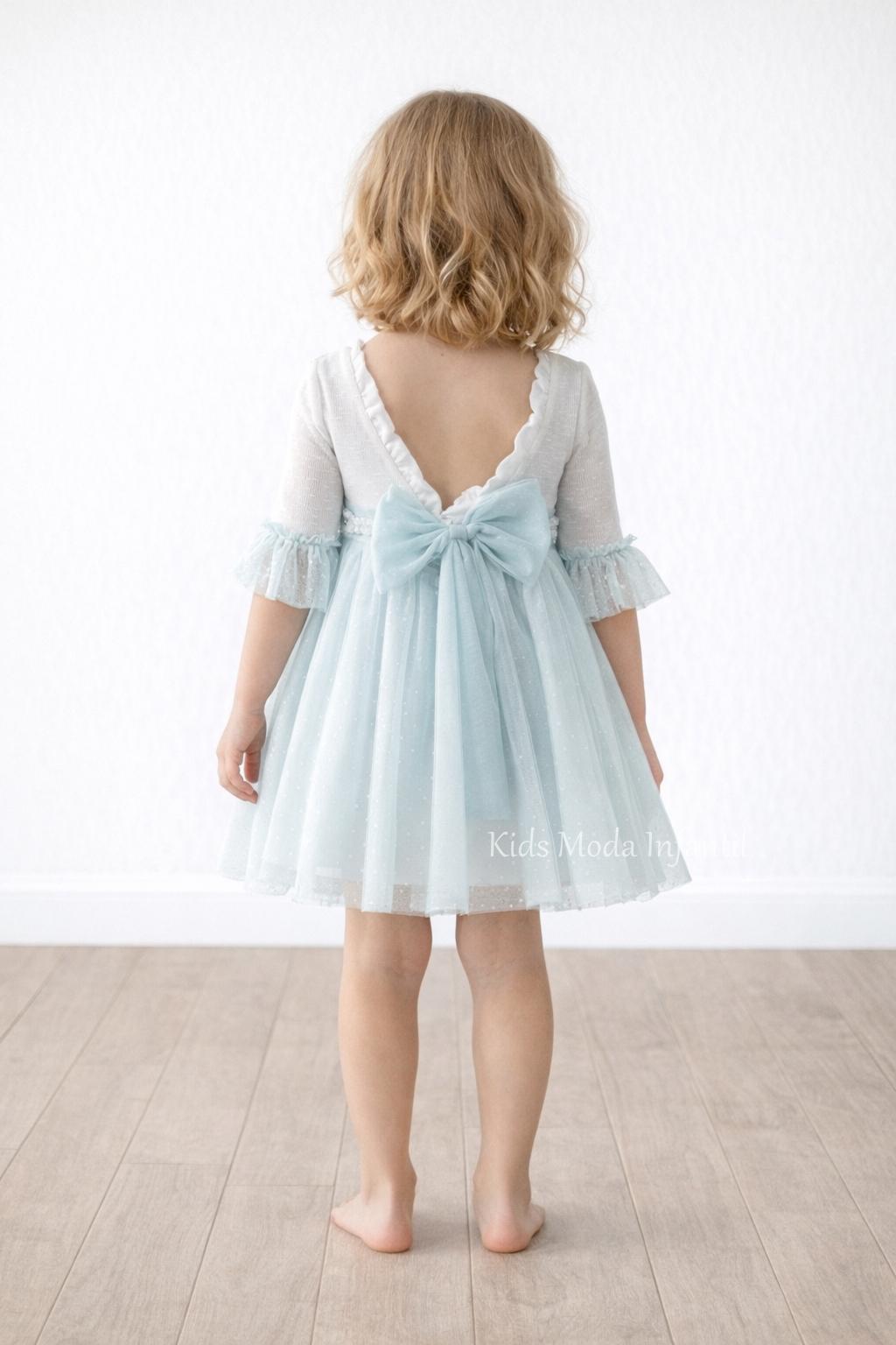 Las mangas terminadas en suave volante de tul refuerzan su estilo dulce y exclusivo, convirtiéndolo en una pieza ideal para niñas que buscan destacar con naturalidad.