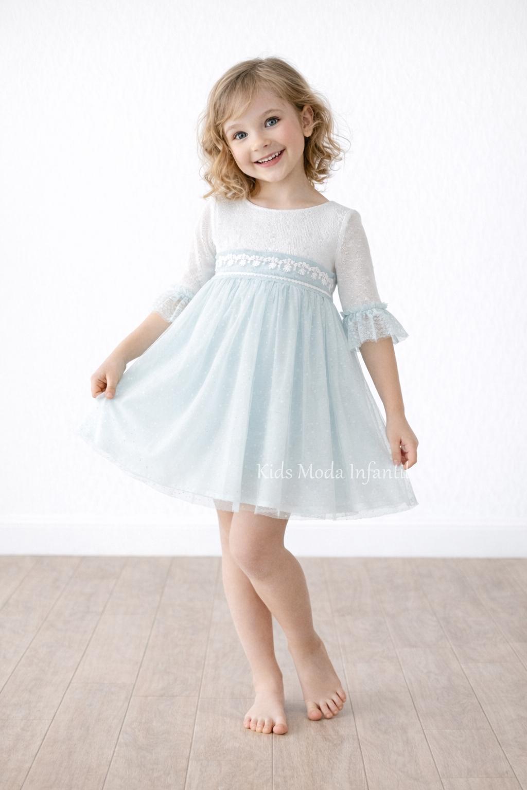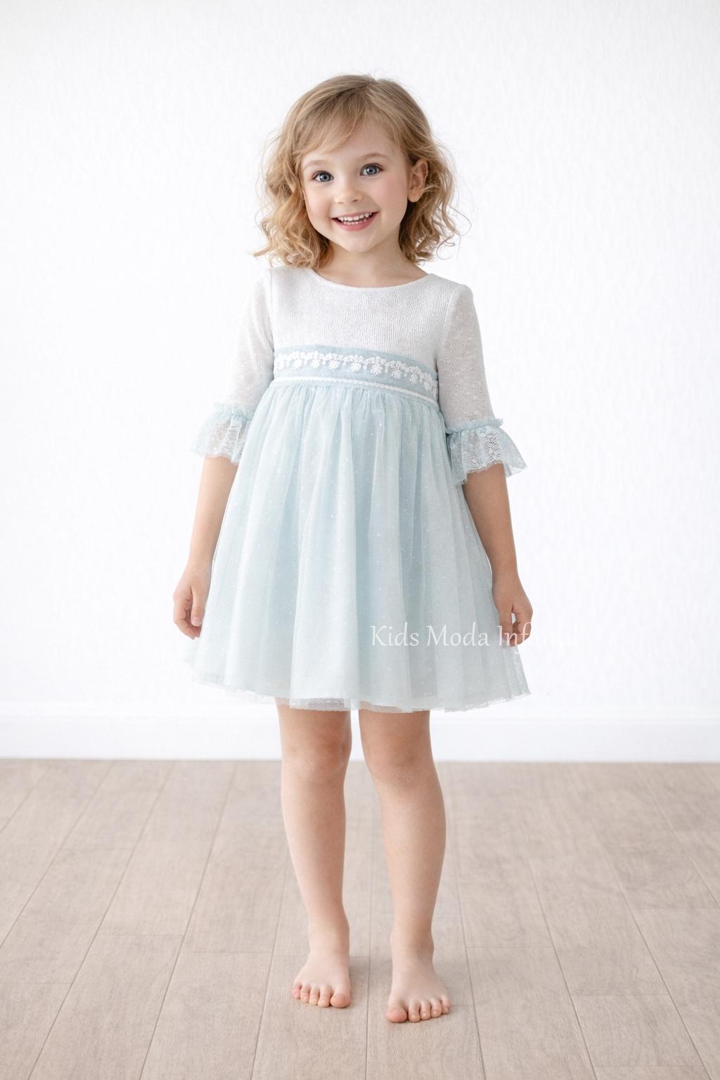 Vestido ceremonia niña manga francesa blanco roto y tul verde agua Basmarti | Kids Moda Infantil