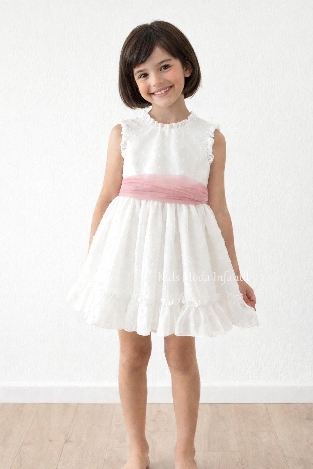 Vestido arras para niñas o vestido ceremonia niña en un estilo elegante y romántico, confeccionado de una forma artesanal con mimo y cuidado para que tu niña luzca ideal con estos vestidos niña arras para esa boda especial. Este vestido de niña vestir arras blanco luce cuerpo y falda en plumeti cristal blanco roto con detalle fruncido en mismo tejido en pequeño volante tanto en cuello como en sisa además luce un volante inferior en todo el vuelo de la falda a la máxima perfección. Este precioso vestido niña ceremonia luce un precioso fajín de tul rosa empolvado con una gran y bonita lazada en espalda bajo escote a pico bordeando un pequeño volante fruncido. Este vestido para niñas arras para bodas con encanto u otros eventos especiales está confeccionado con un delicado tejido plumeti de cristal de gran caída y con una falda en talle medio alto de gran vuelo. Lleva braga a juego hasta talla 48 meses.