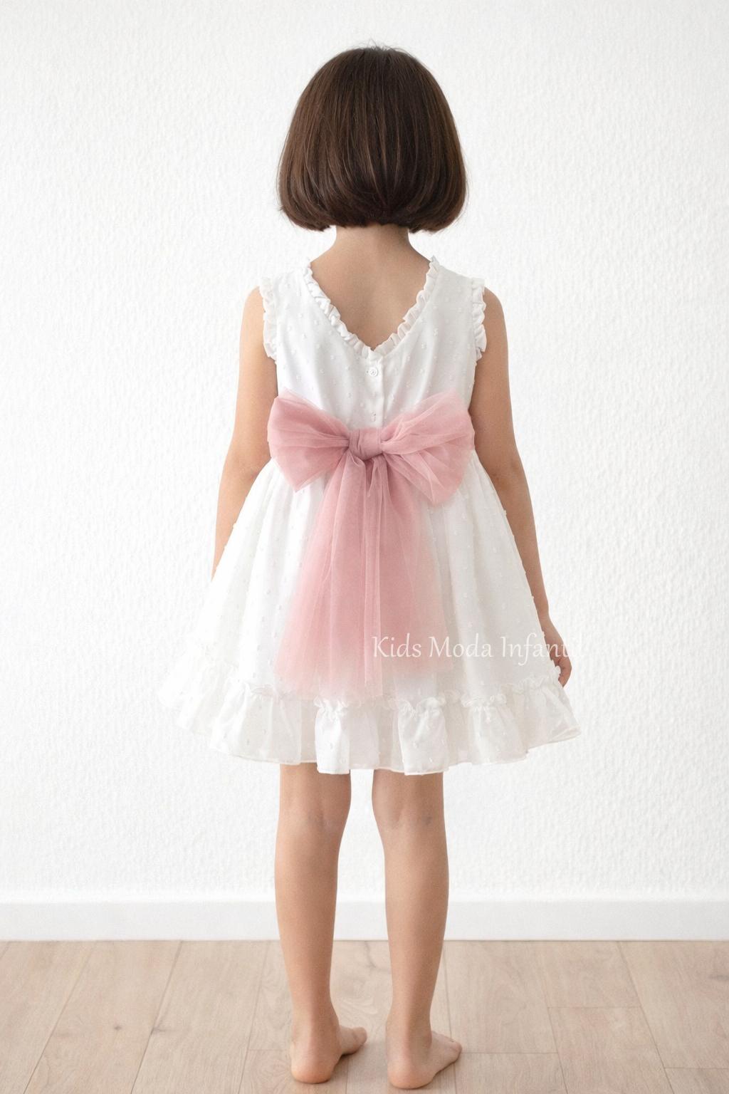 Precioso y elegante vestido ceremonia para niña sin mangas confeccionado en cuerpo y falda de vuelo de plumeti blanco roto combinando precioso fajín tul rosa empolvado con lazada en espalda. Lleva braga a juego hasta talla 48 meses. Te enamorará su precioso escote a pico bajo en espalda y preciosa lazada de tul.