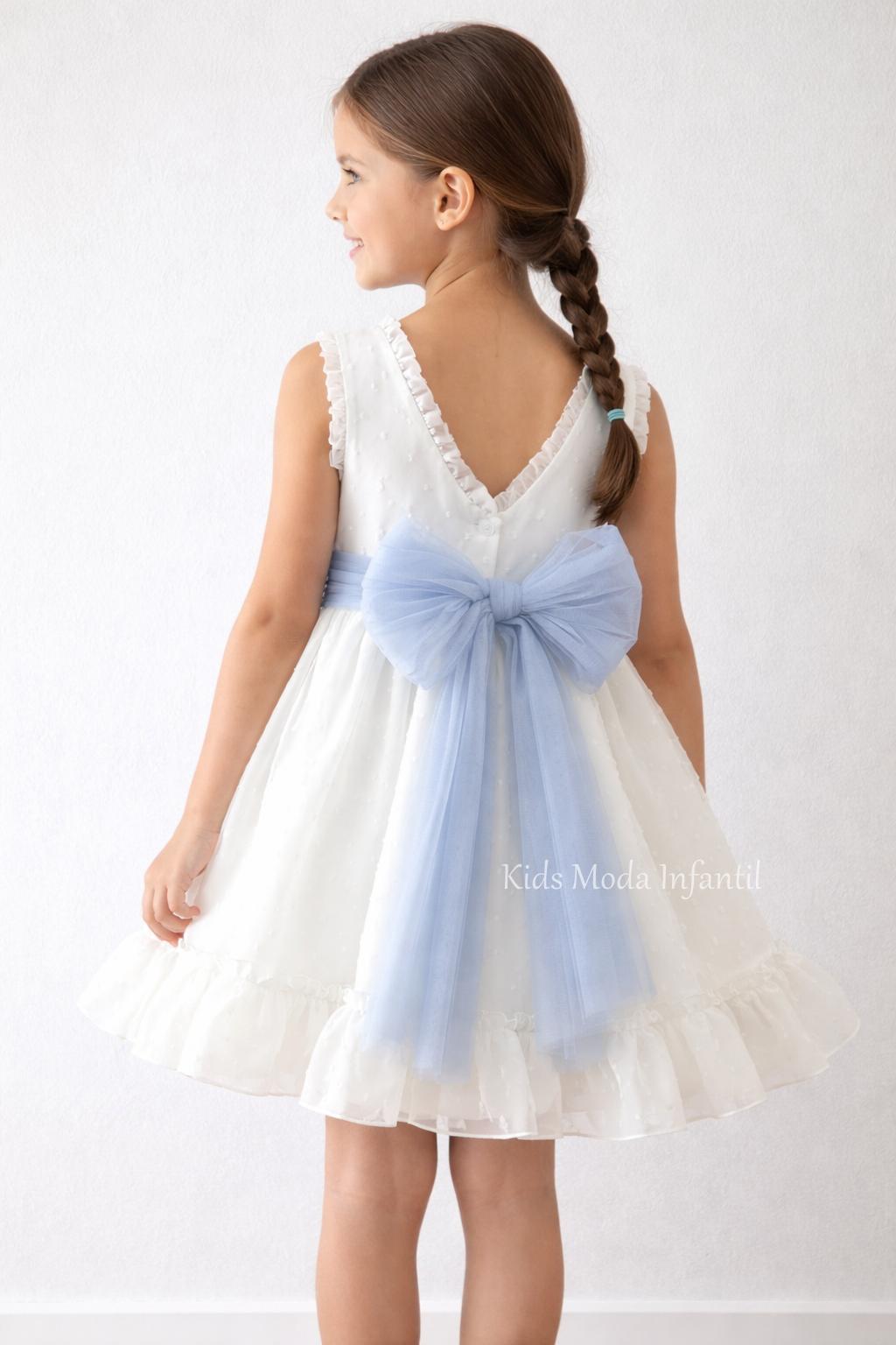 Precioso y elegante vestido de ceremonia para niña sin mangas confeccionado en cuerpo y falda de vuelo de plumeti blanco roto combinando precioso fajín tul azul con lazada en espalda. Lleva braga a juego hasta talla 48 meses. Te enamorará su precioso escote a pico bajo en espalda y preciosa lazada de tul.
