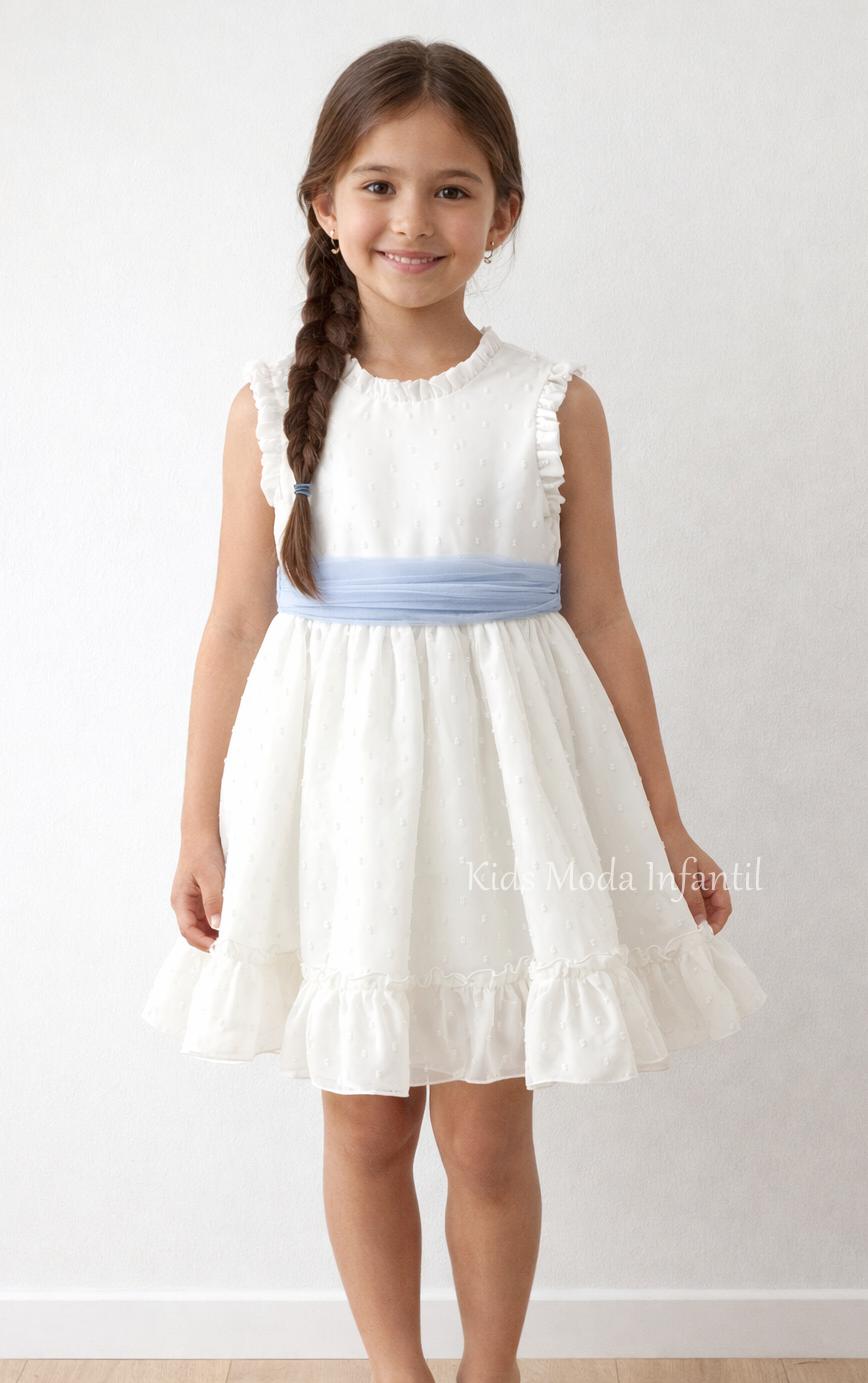 Vestido ceremonia niña o vestido arras para niñas en un estilo elegante y romántico, confeccionado de una forma artesanal con mimo y cuidado para que tu niña luzca ideal con estos vestidos niña arras para esa boda especial. Este vestido de niña vestir arras blanco luce cuerpo y falda en plumeti cristal blanco roto con detalle fruncido en mismo tejido en pequeño volante tanto en cuello como en sisa además luce un volante inferior en todo el vuelo de la falda a la máxima perfección. Este precioso vestido niña ceremonia luce un precioso fajín de tul azul con una gran y bonita lazada en espalda bajo escote a pico bordeando un pequeño volante fruncido. Este vestido para niñas arras para bodas con encanto u otros eventos especiales está confeccionado con un delicado tejido plumeti de cristal de gran caída y con una falda en talle medio alto de gran vuelo. Lleva braga a juego hasta talla 48 meses.