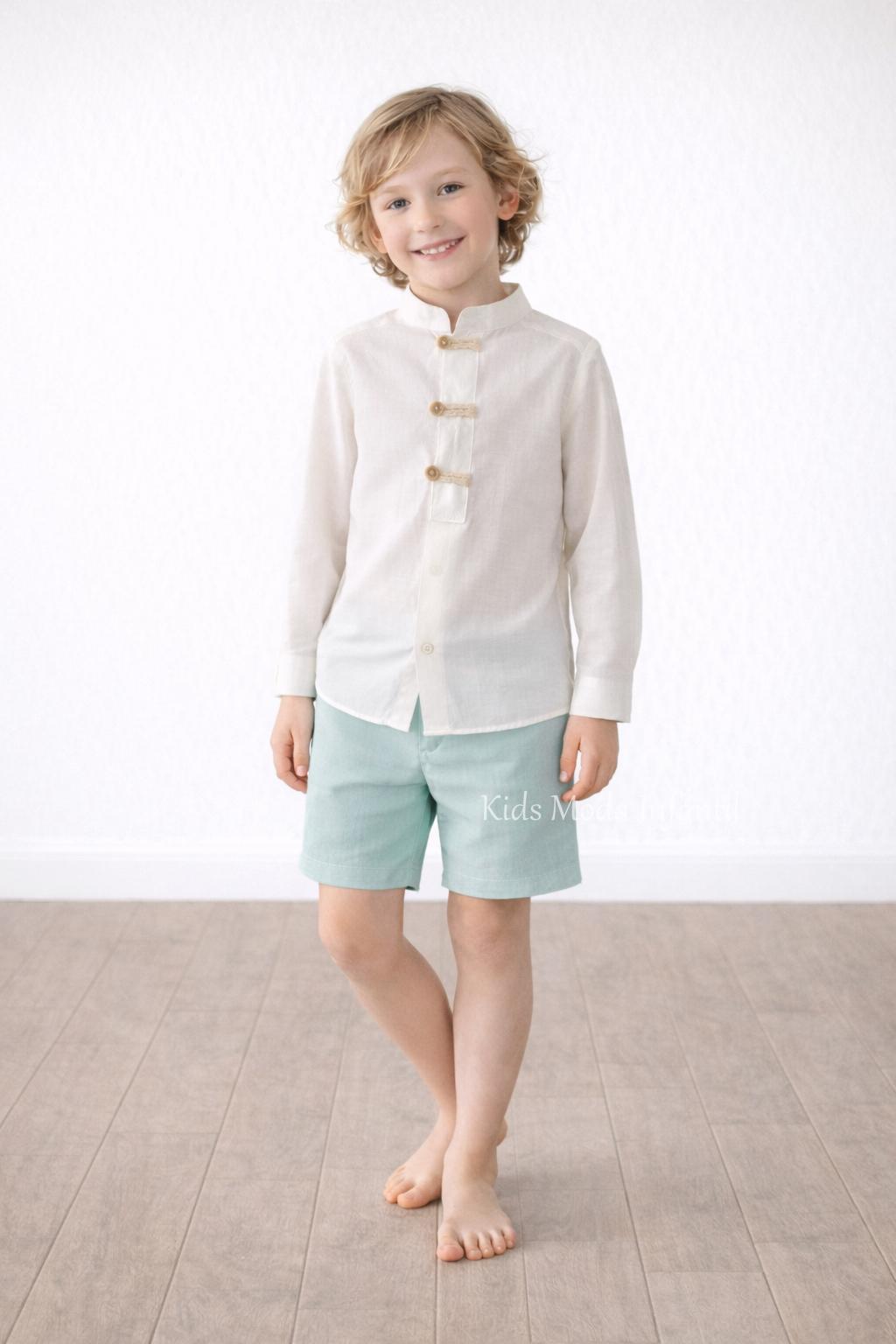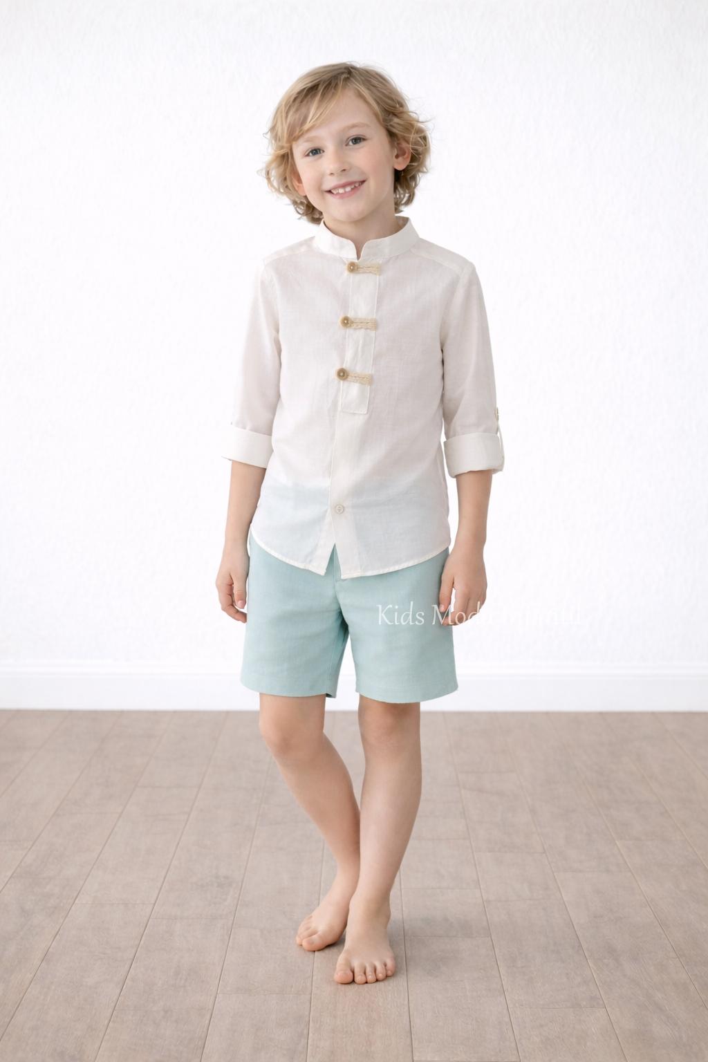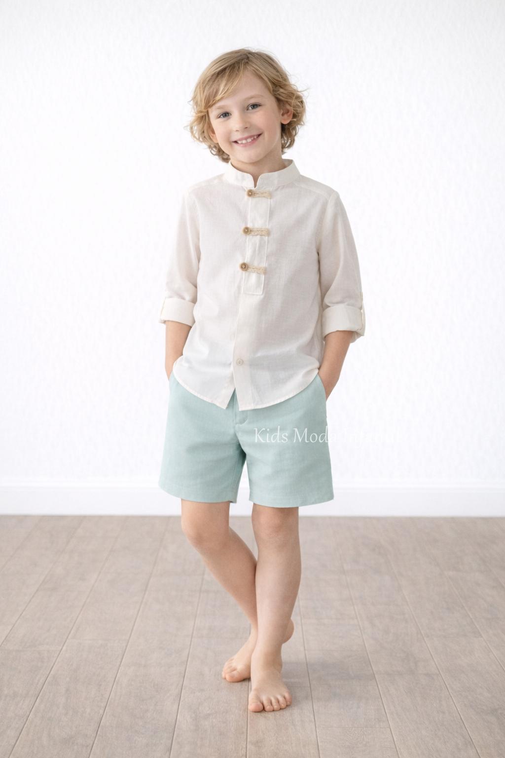 Conjunto ceremonia niño de Basmarti con camisa de lino blanco roto y bermuda verde agua. Elegante, cómodo y perfecto para arras, bodas y eventos especiales.