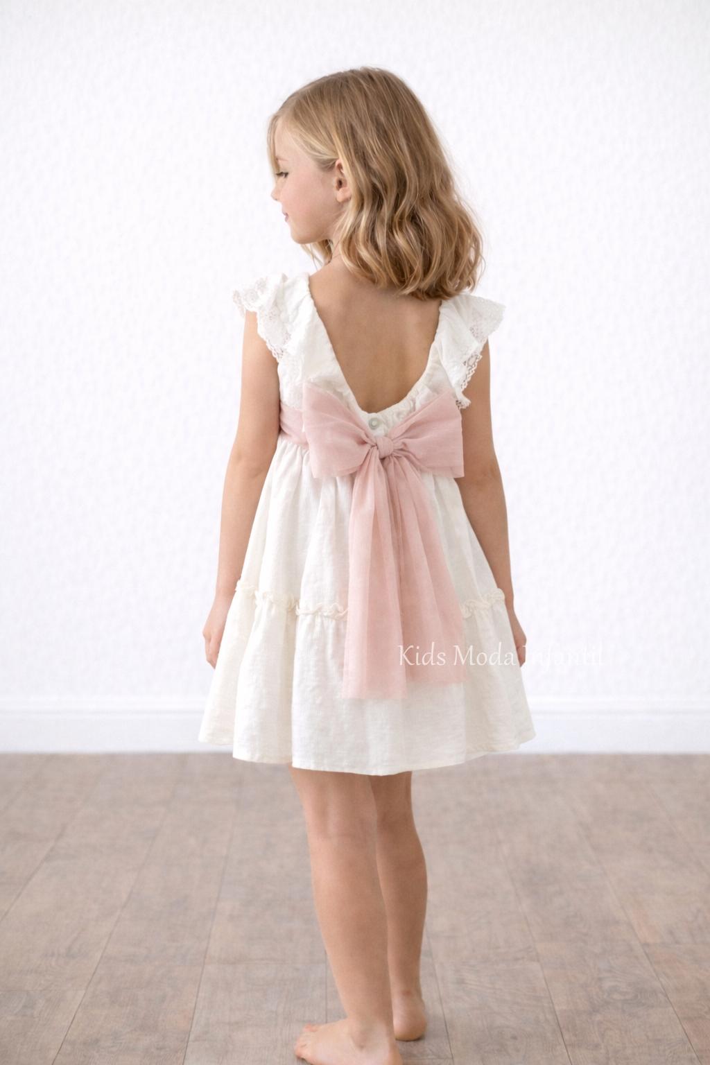 Vestido ceremonia niña beige claro de Basmarti con manga corta de volante y fajín de tul rosa empolvado. Diseño elegante con espalda en pico y lazo trasero, ideal para bodas y arras.