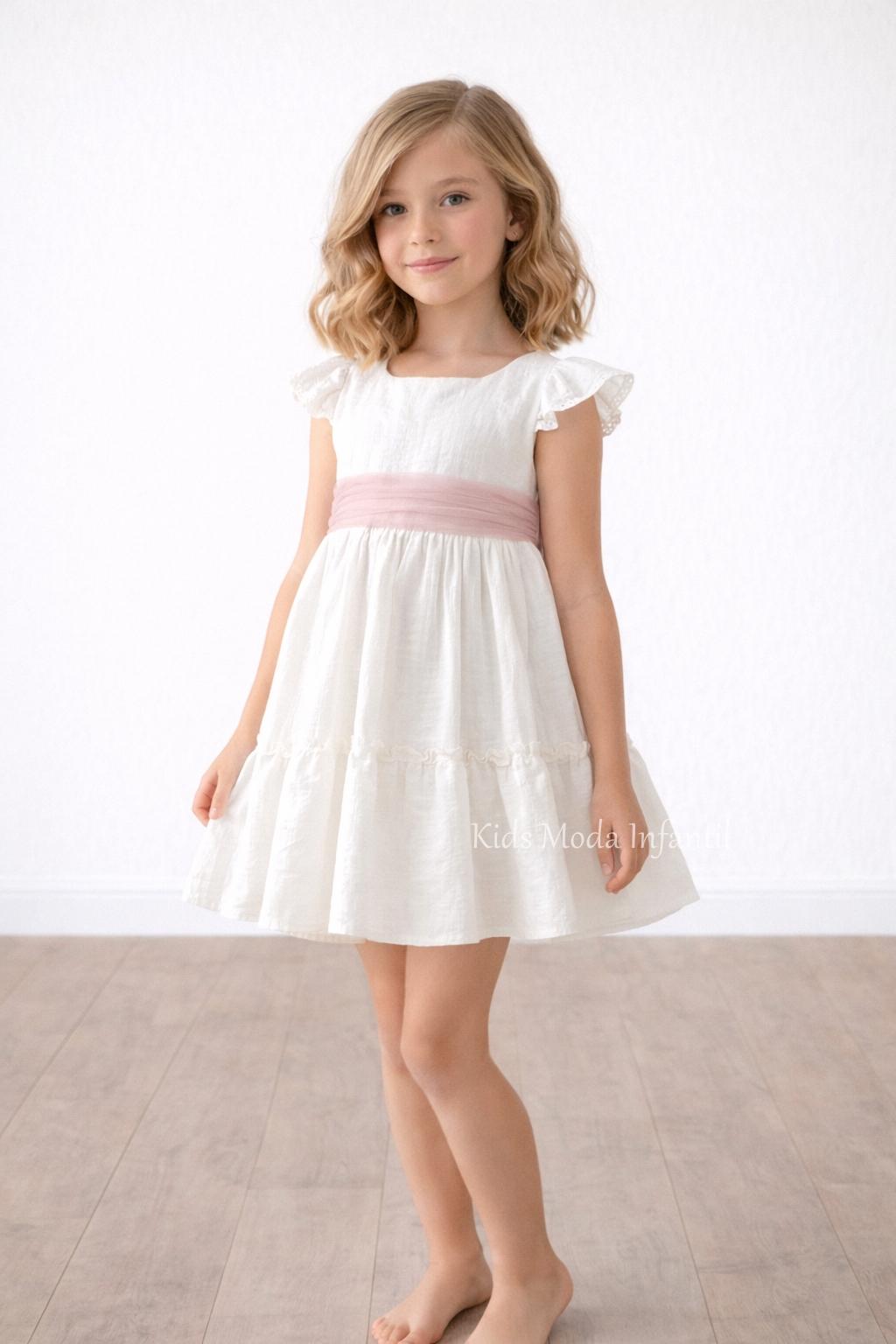 Vestido ceremonia niña beige claro manga corta volante con fajín tul rosa empolvado Basmarti | Kids Moda Infantil