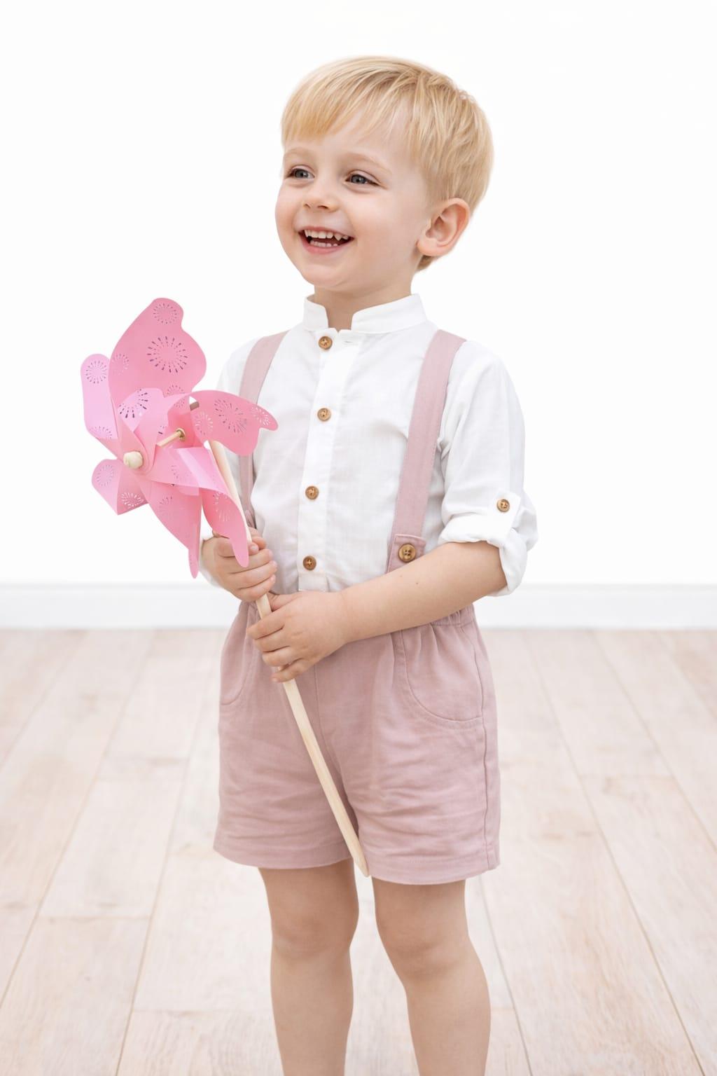 Conjunto ceremonia niño camisa lino y bermuda con tirantes rosa empolvado de coco acqua
