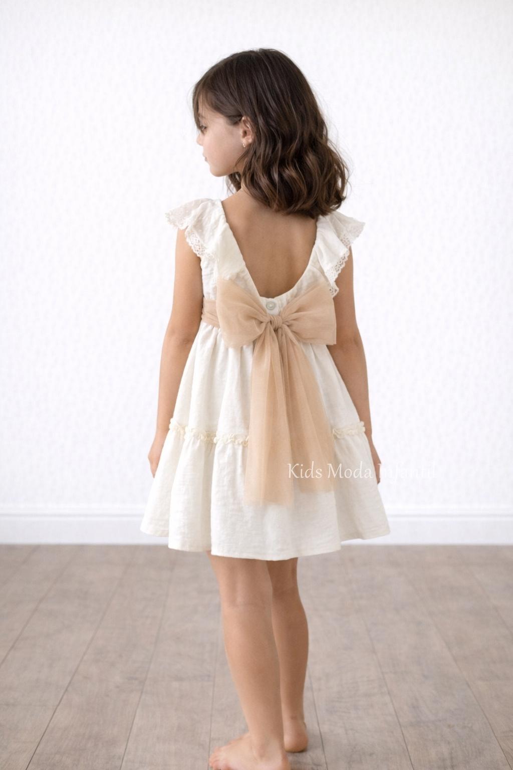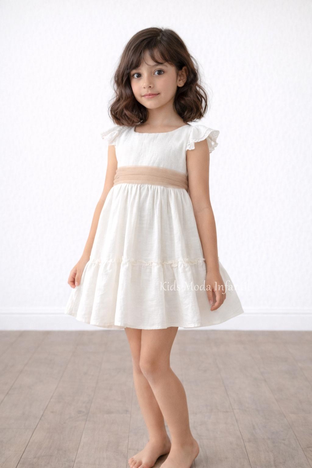 Una opción perfecta para quienes buscan un vestido de ceremonia niña elegante, natural y con estilo sofisticado, ideal para combinar con complementos en tonos tierra, beige o empolvados.