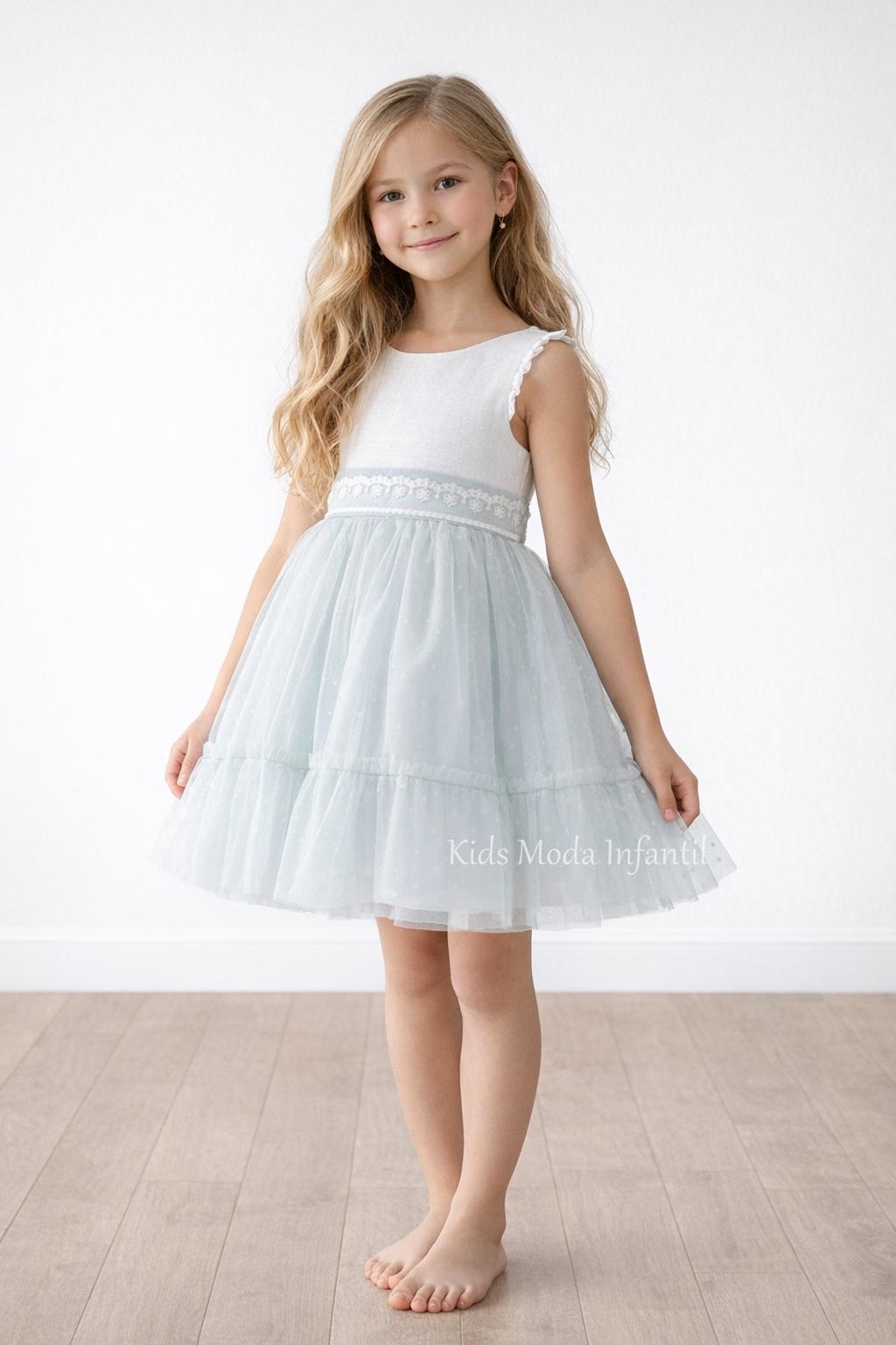 El cuerpo en blanco roto aporta luz y elegancia, mientras que la falda de tul verde agua con caída vaporosa añade movimiento y un acabado romántico. Incorpora un precioso detalle en la cintura con puntilla bordada, realzando la silueta y aportando un toque artesanal.