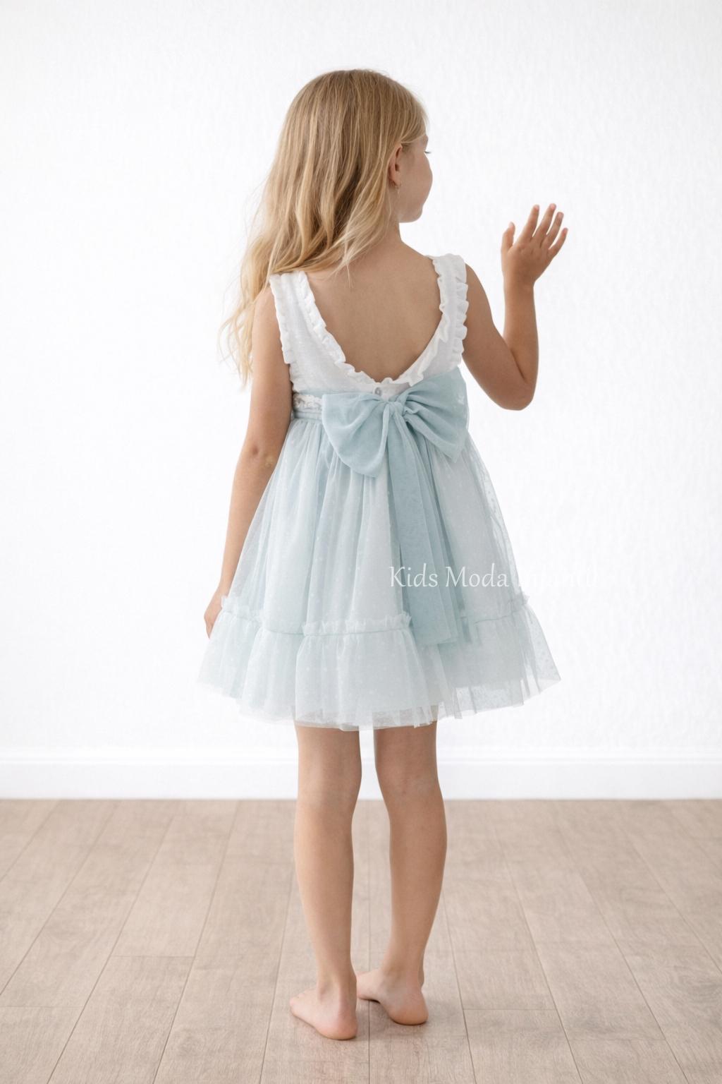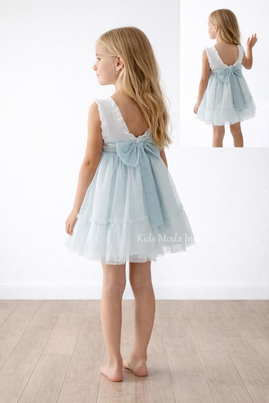 Vestido ceremonia niña blanco roto con falda de tul verde agua de Basmarti, con espalda en pico y gran lazada trasera. Elegante, dulce y perfecto para arras y eventos especiales.