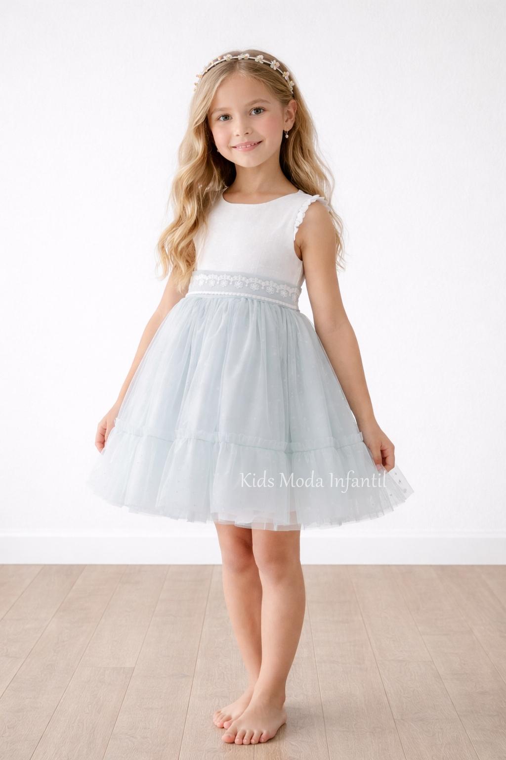 Vestido ceremonia y arras niña blanco roto con tul verde agua Basmarti | Kids Moda Infantil