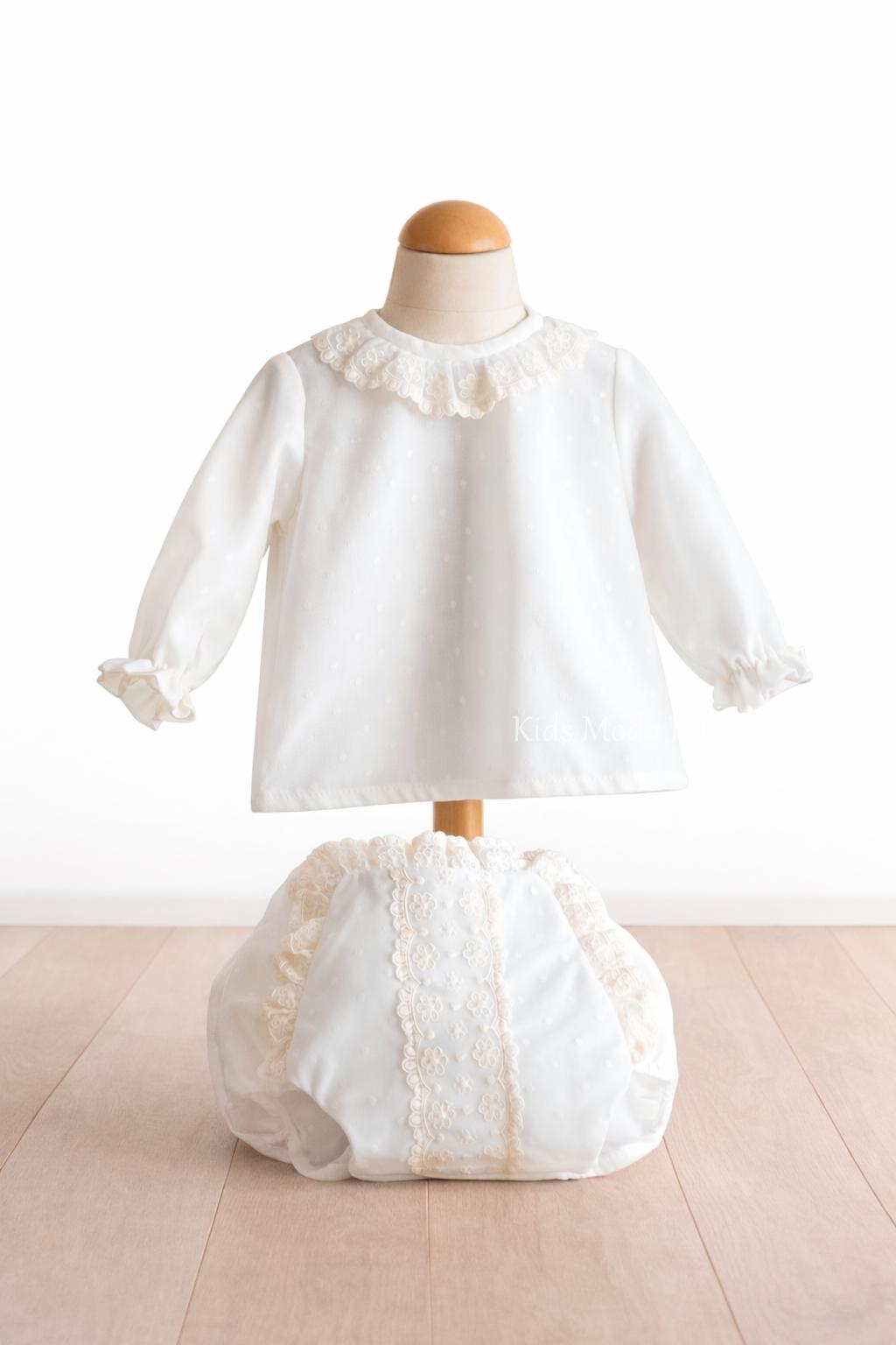 La camisa de manga larga está confeccionada en tul bodoque, con posibilidad de adaptación a manga corta o sin mangas (consultar opciones). Presenta un delicado volante en el cuello con tul bordado, a juego con el cubre pañal, que incorpora puntilla bordada.
