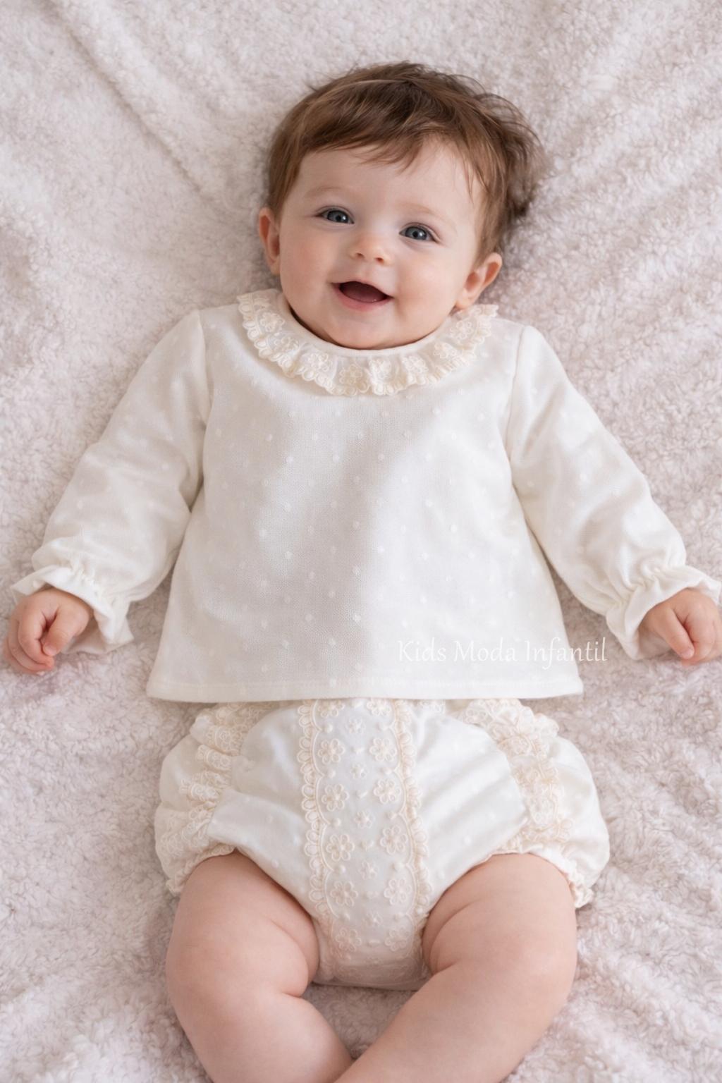 Precioso conjunto de bautizo para bebé en tul bodoque beige, compuesto por dos piezas: camisa y cubre pañal, diseñado para vestir al bebé con elegancia, delicadeza y confort en un día tan especial como su bautizo.