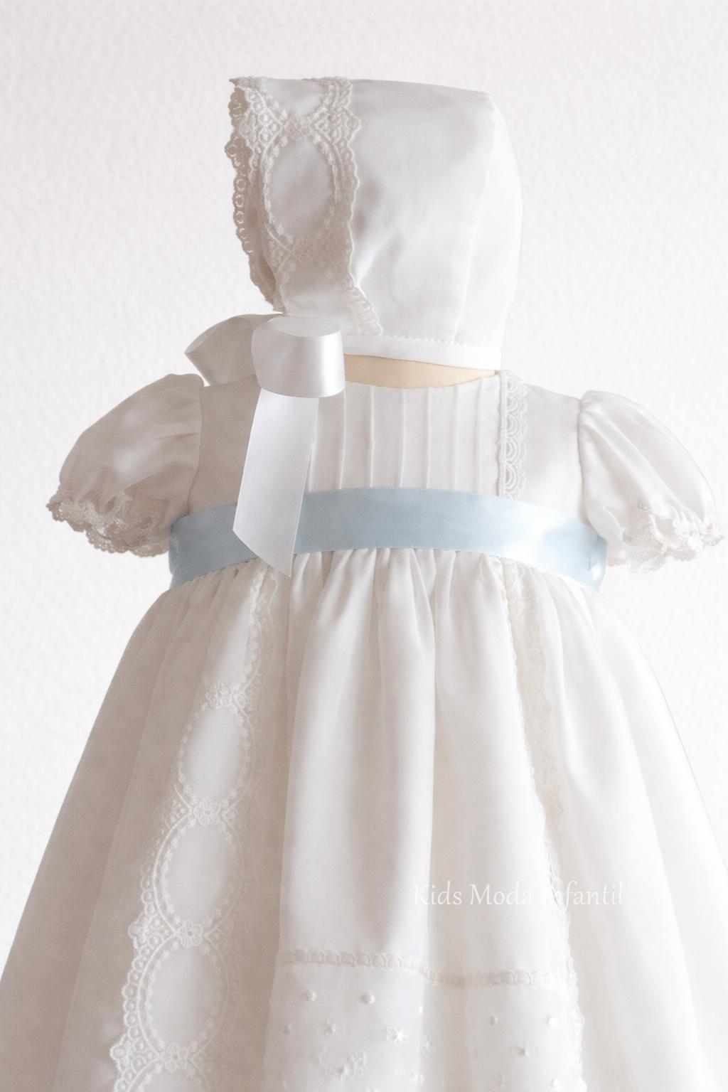 Confeccionado en delicado tejido de gasa blanca, presenta cuello redondeado, cuerpo de jaretas y falda con puntillas bordadas, creando un acabado elegante y armonioso. Luce un bonito fajín de raso celeste y cierre trasero con botones para mayor comodidad.