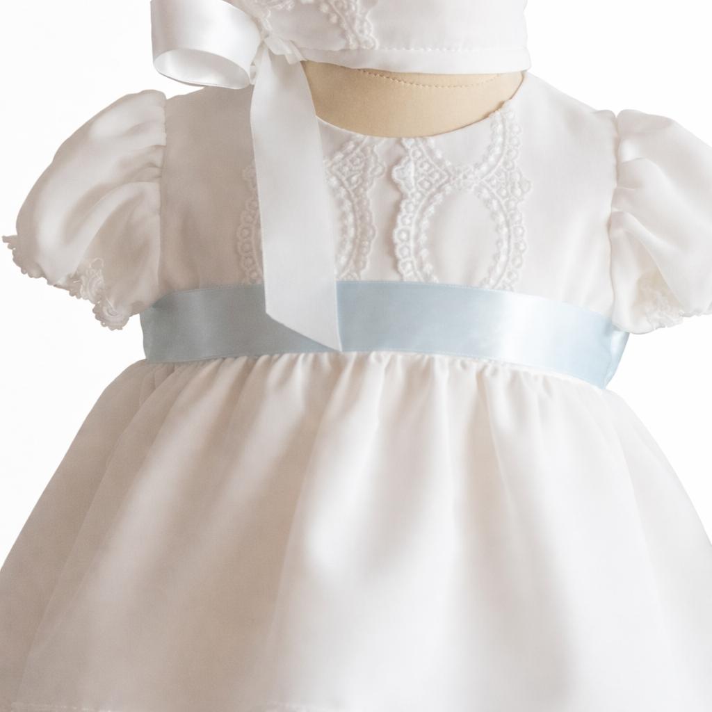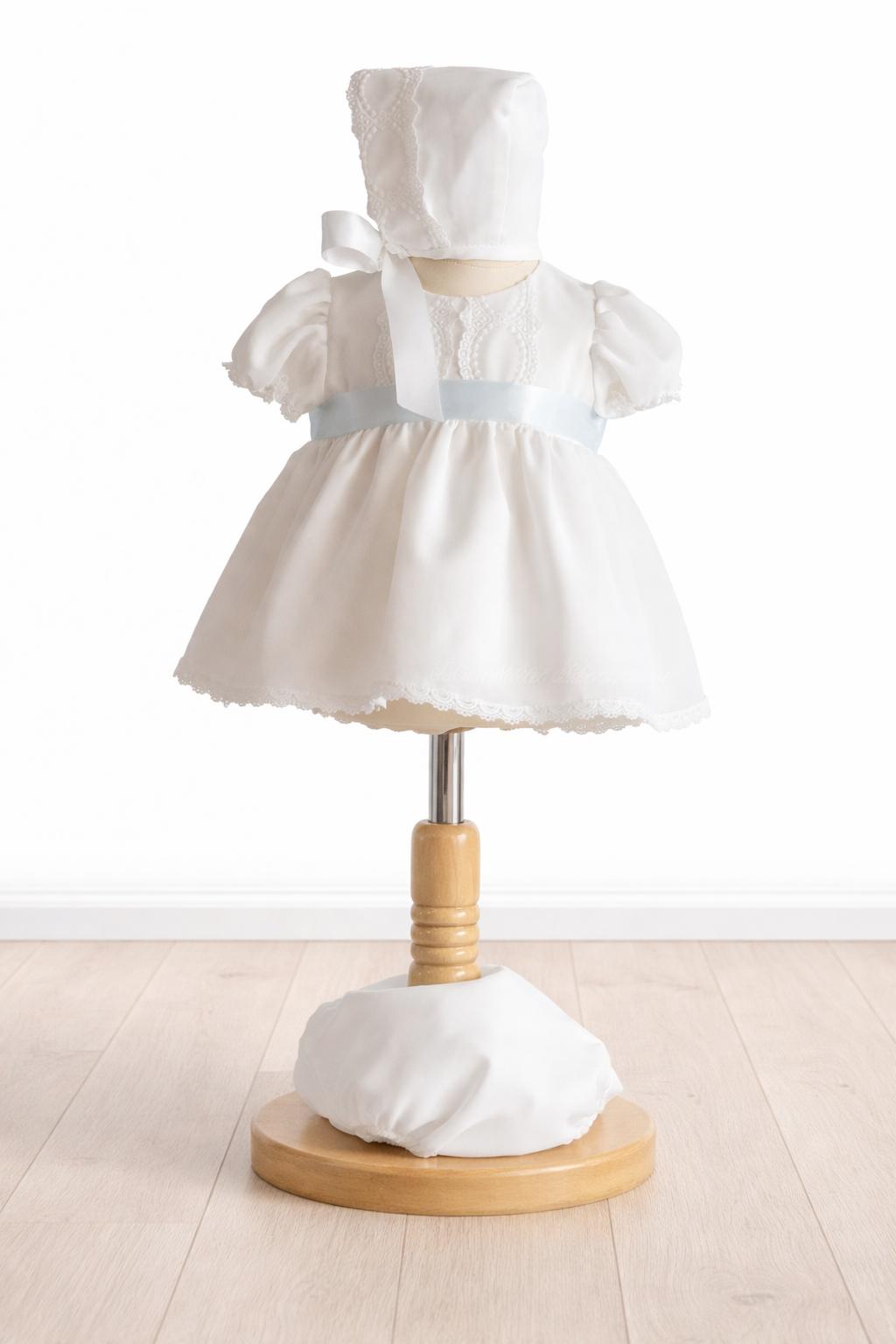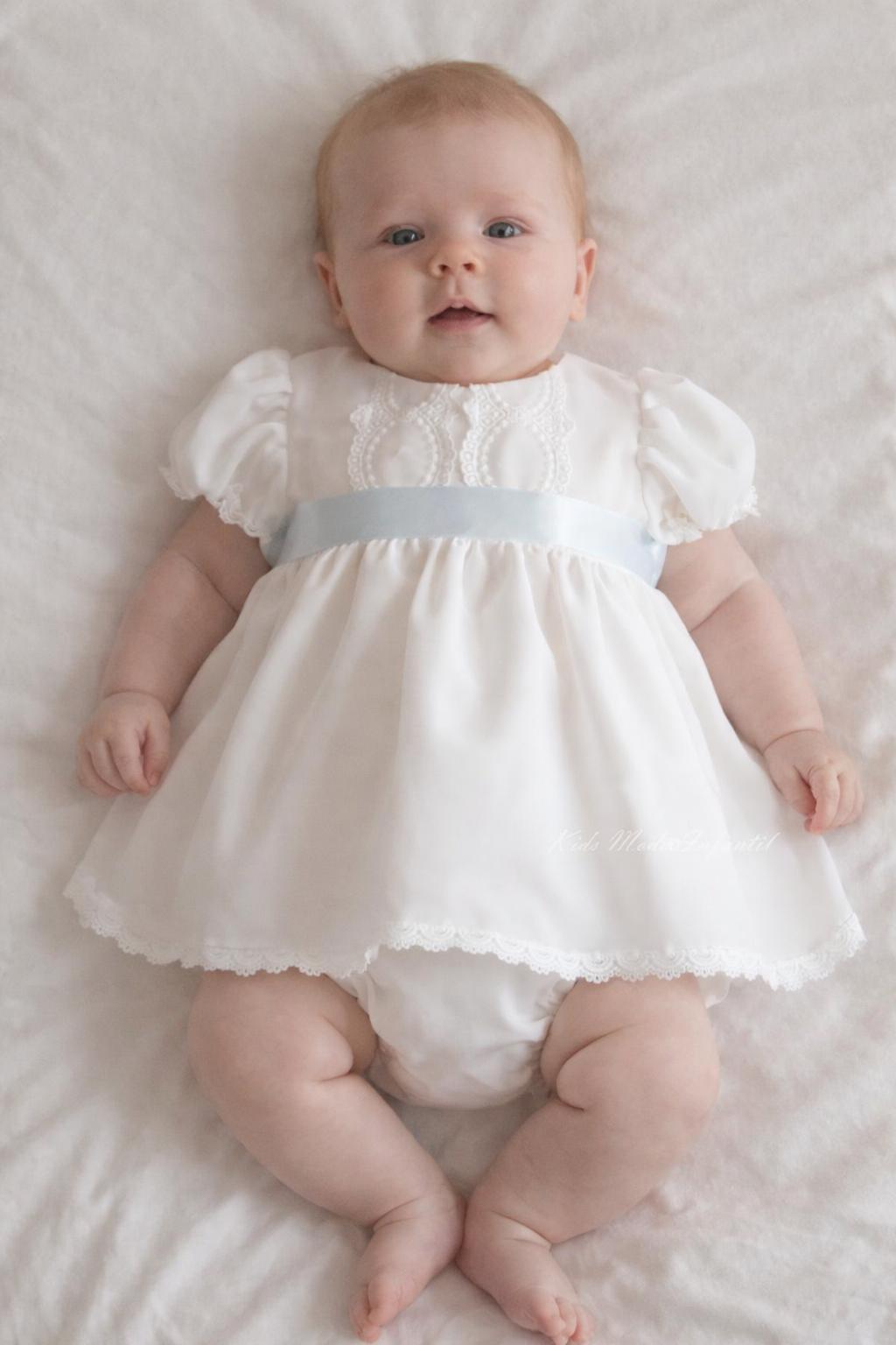 Vestido bautizo gasa blanco con braguita de manga corta (con posibilidad de hacer manga larga y sin manga, ver en opciones de prenda). Este precioso jesusito bebe está confeccionado con un bonito tejido gasa blanco, con cuello redondeado, con cuerpo entallado con aplicación bordada, fajín cinta raso celeste (con posibilidad de cambiar el color, ver opciones de prenda) y falda de vuelo. Este jesusito de bebe incluye cubre pañal, pero no incluye capota, pudiendo añadirla más adelante en opciones de prenda.