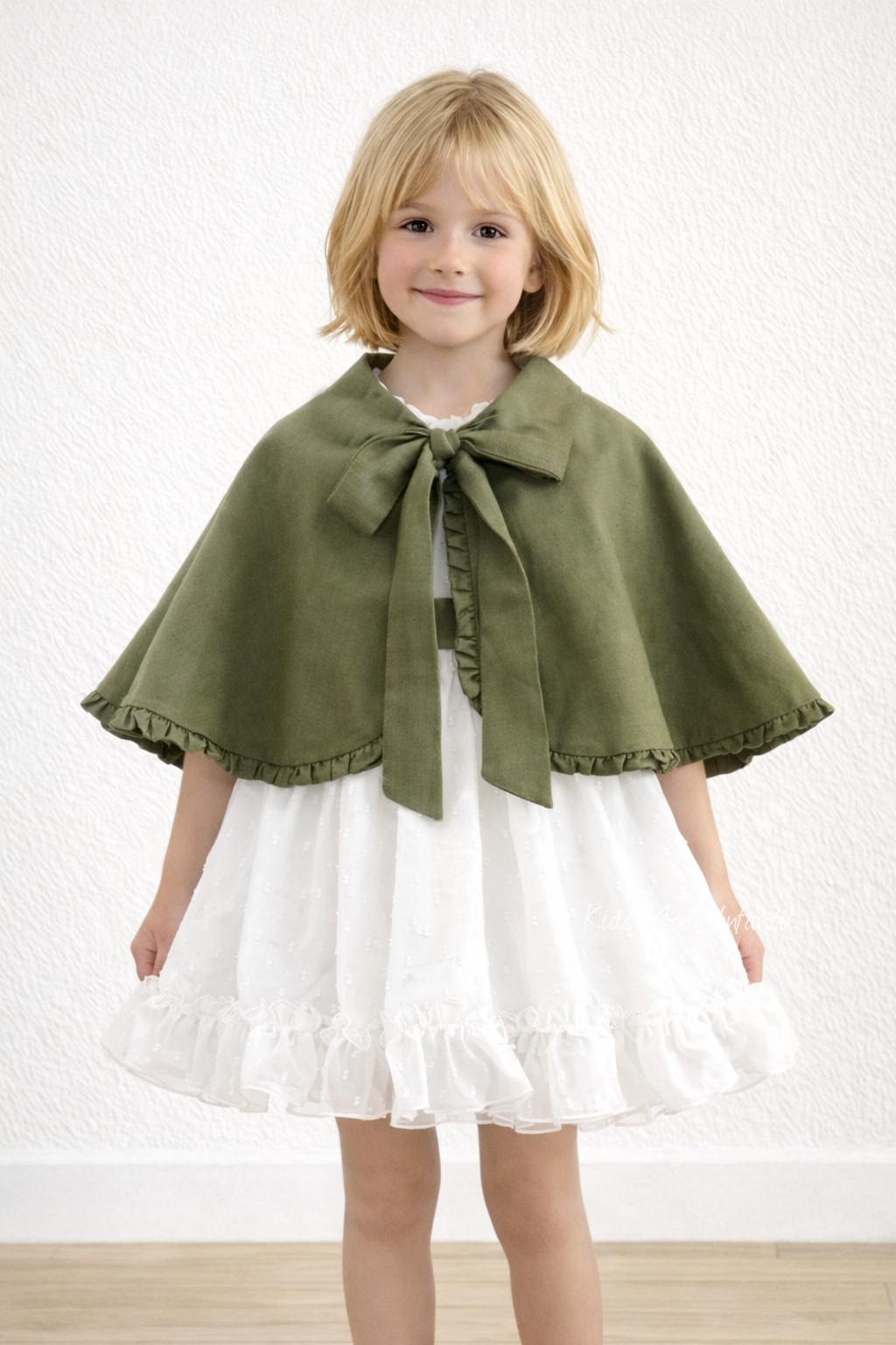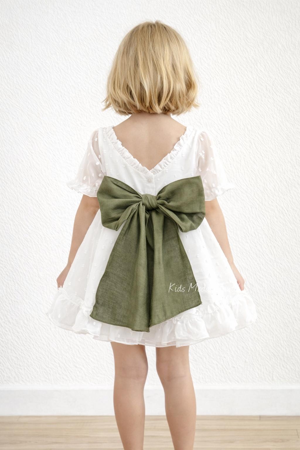 Vestido arras niña plumeti cristal con fajín lino verde oliva Eva Martinez Artesanía 32111
