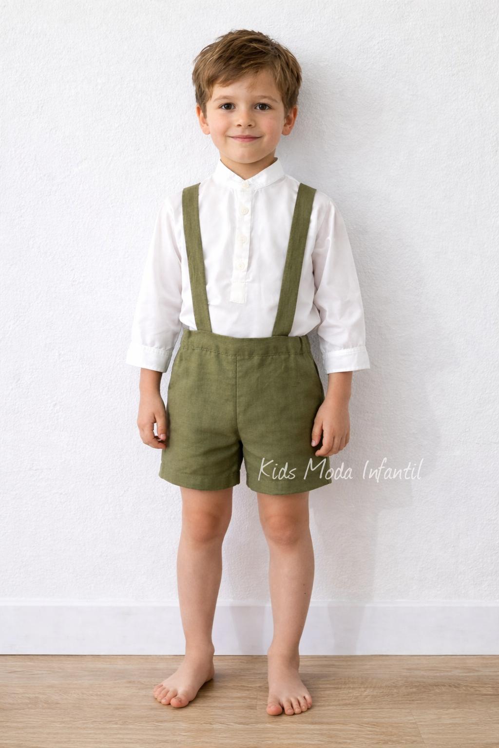 Precioso conjunto niño vestir arras y ceremonias especiales confeccionado en dos prendas, camisa popelín blanco roto, con botonadura vista cuerpo con cuello Mao; combinando precioso pantalón bermuda de tirantes en tejido lino verde oliva (verde seco), perfecto e ideal para combinar con los preciosos vestidos de niña arras Eva Martínez Artesanía 32111cbg.