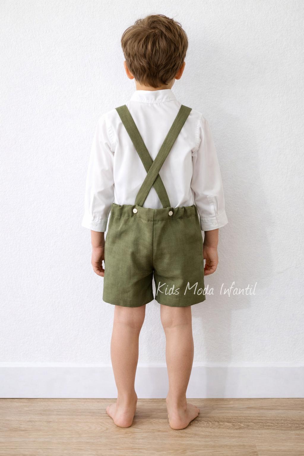 Conjunto ceremonia niño camisa y peto con tirantes verde oliva de Eva Martinez Artesania