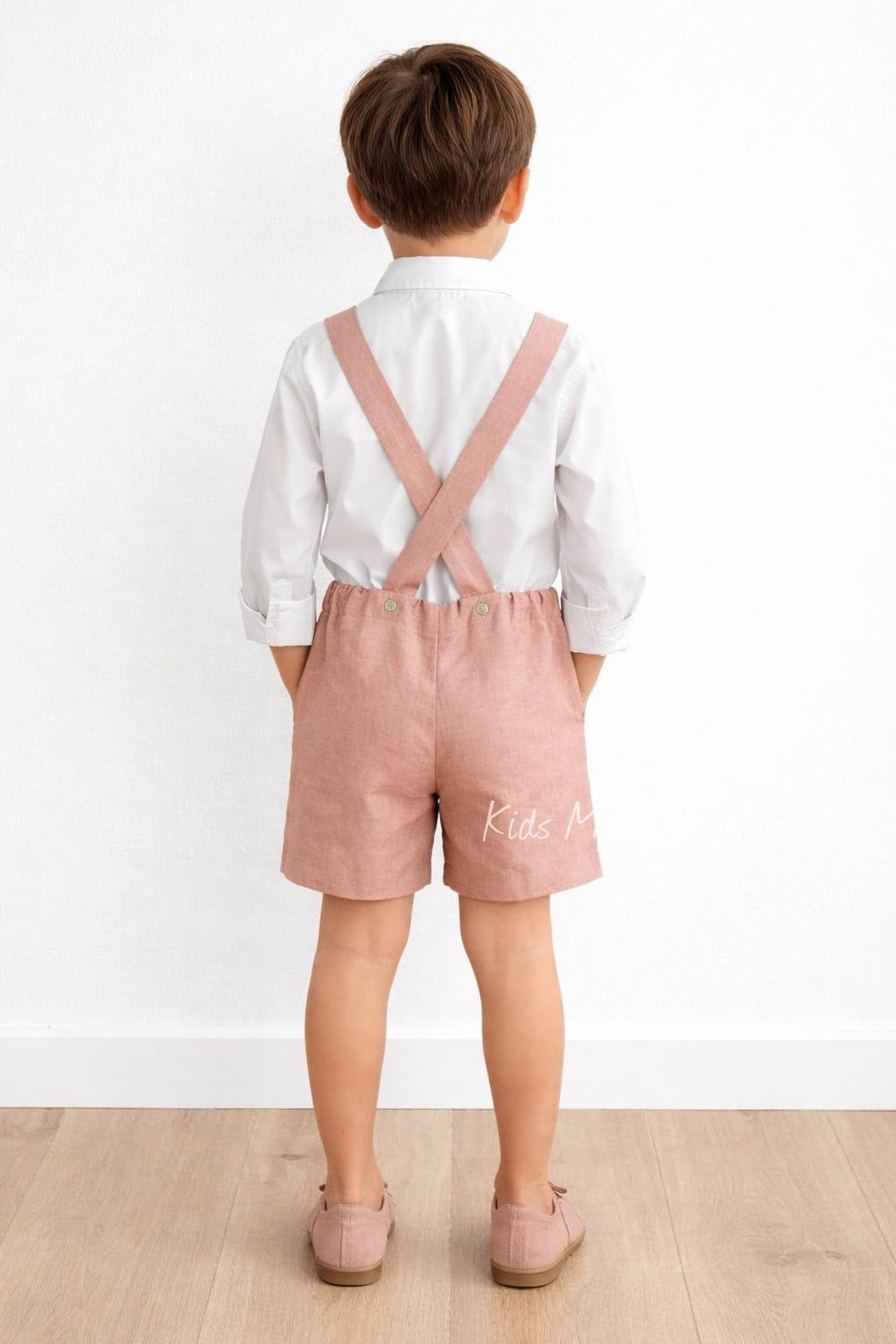 Conjunto ceremonia niño camisa y peto con tirantes rosa empolvado de Eva Martinez Artesania