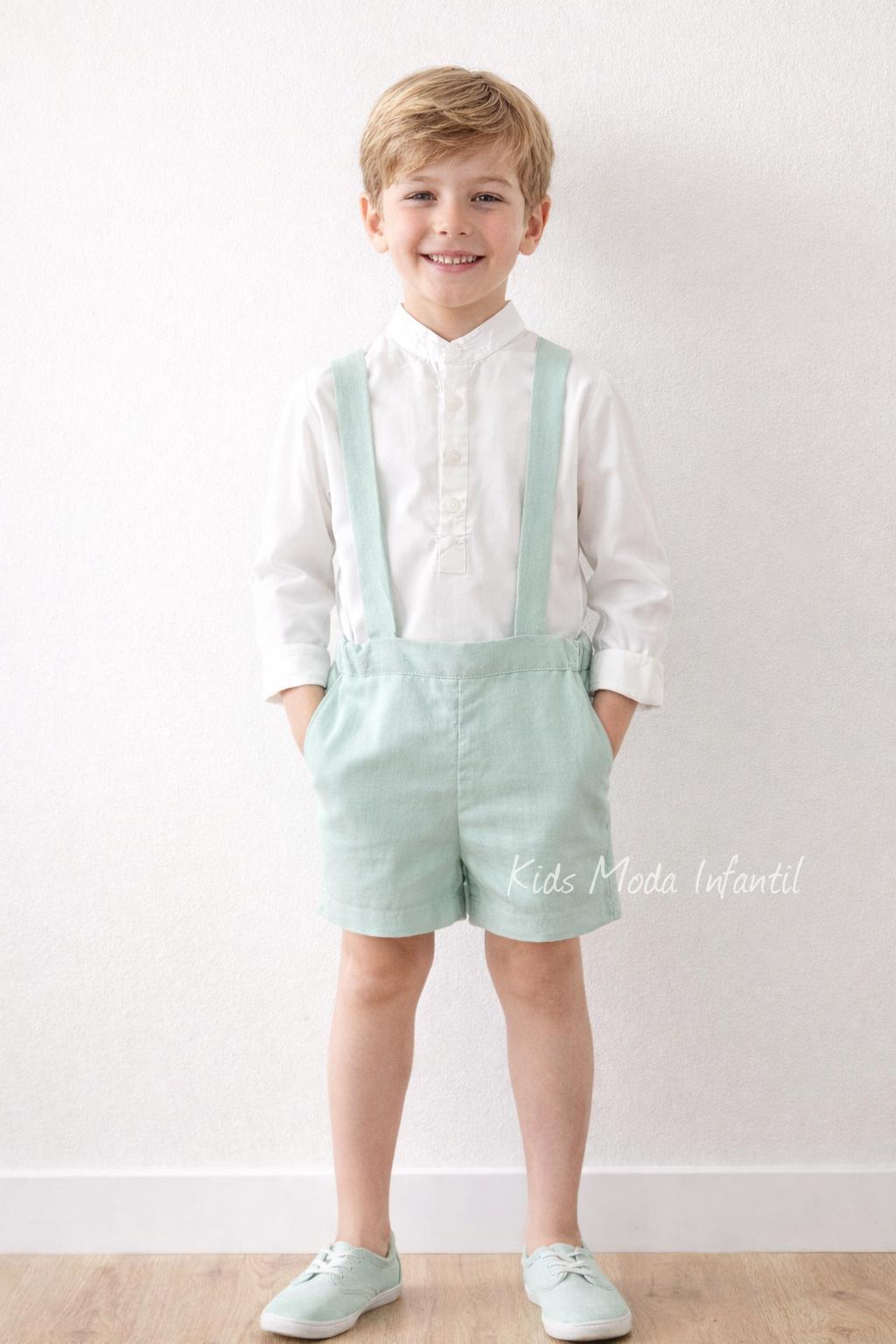 Precioso conjunto niño vestir arras y ceremonias especiales confeccionado en dos prendas, camisa popelín blanco roto, con botonadura vista cuerpo con cuello Mao; combinando precioso pantalón bermuda de tirantes en tejido lino verde empolvado, perfecto e ideal para combinar con los preciosos vestidos de niña arras Eva Martínez Artesanía 32111cbg.