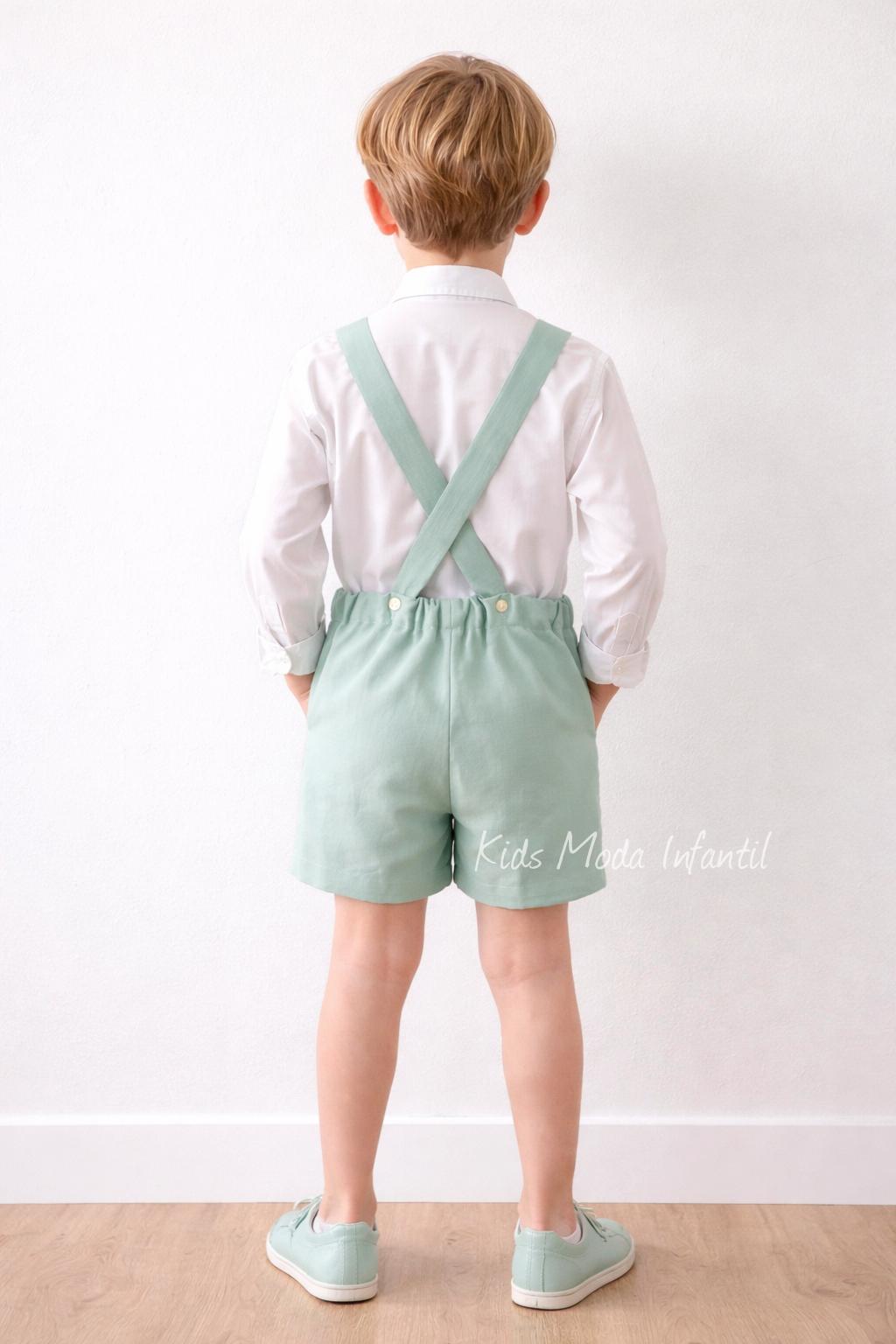Conjunto ceremonia niño camisa y peto con tirantes verde empolvado empolvado de Eva Martinez Artesania