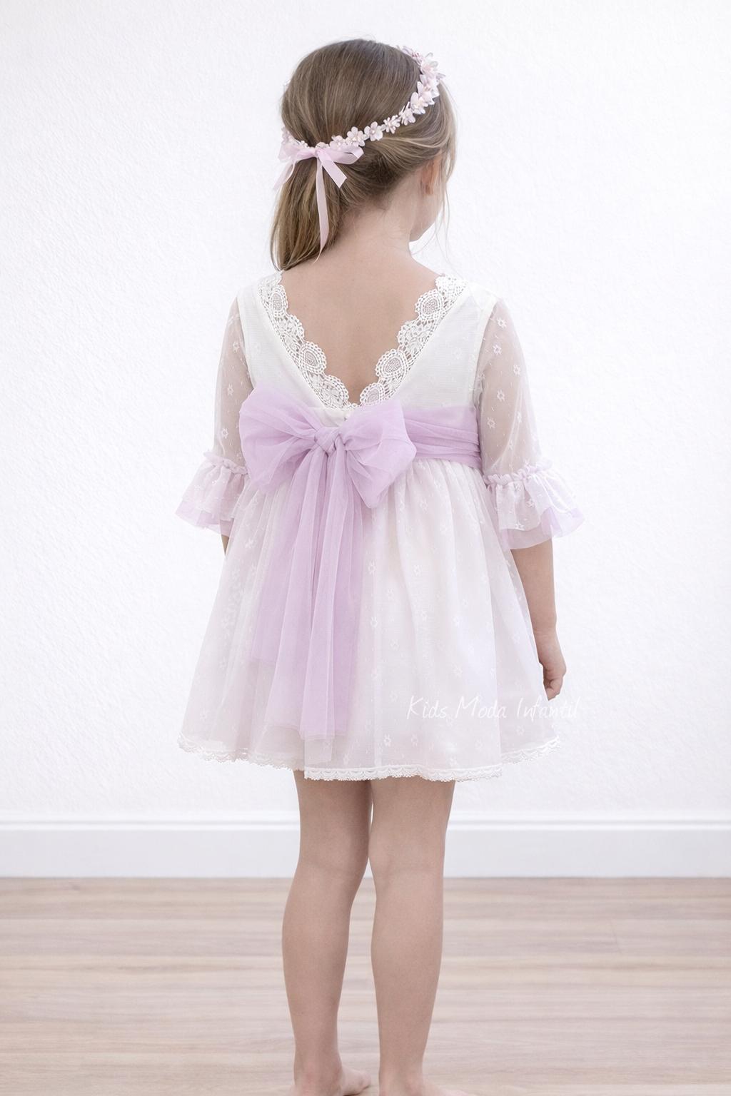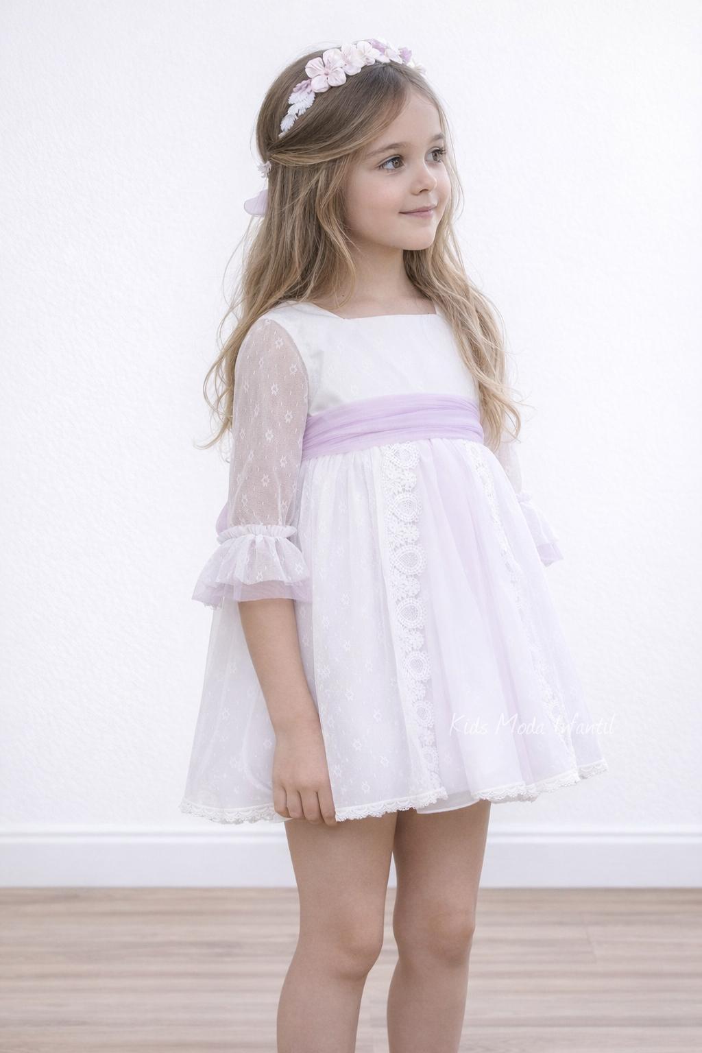 Vestido ceremonia niña blanco media manga con fajín lila de Eva Martínez Artesanía 38111CBG