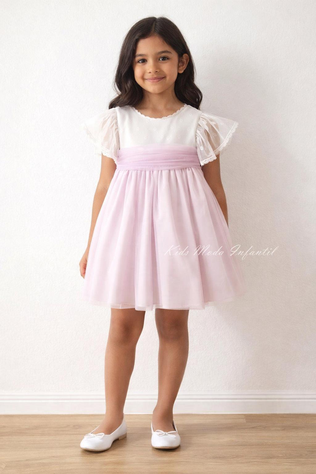 Precioso vestido ceremonia niña, vestido arras niña un precioso tul blanco con sutil detalle en cuerpo y falda de vuelo combinando tul blanco con tul lila. Te encantará el fajín de tul lila con preciosa lazada trasera en espalda y el precioso escote a pico, además luce preciosa manga murciélago sobre los hombros. Lleva braga a juego hasta talla 4 años largura CBG