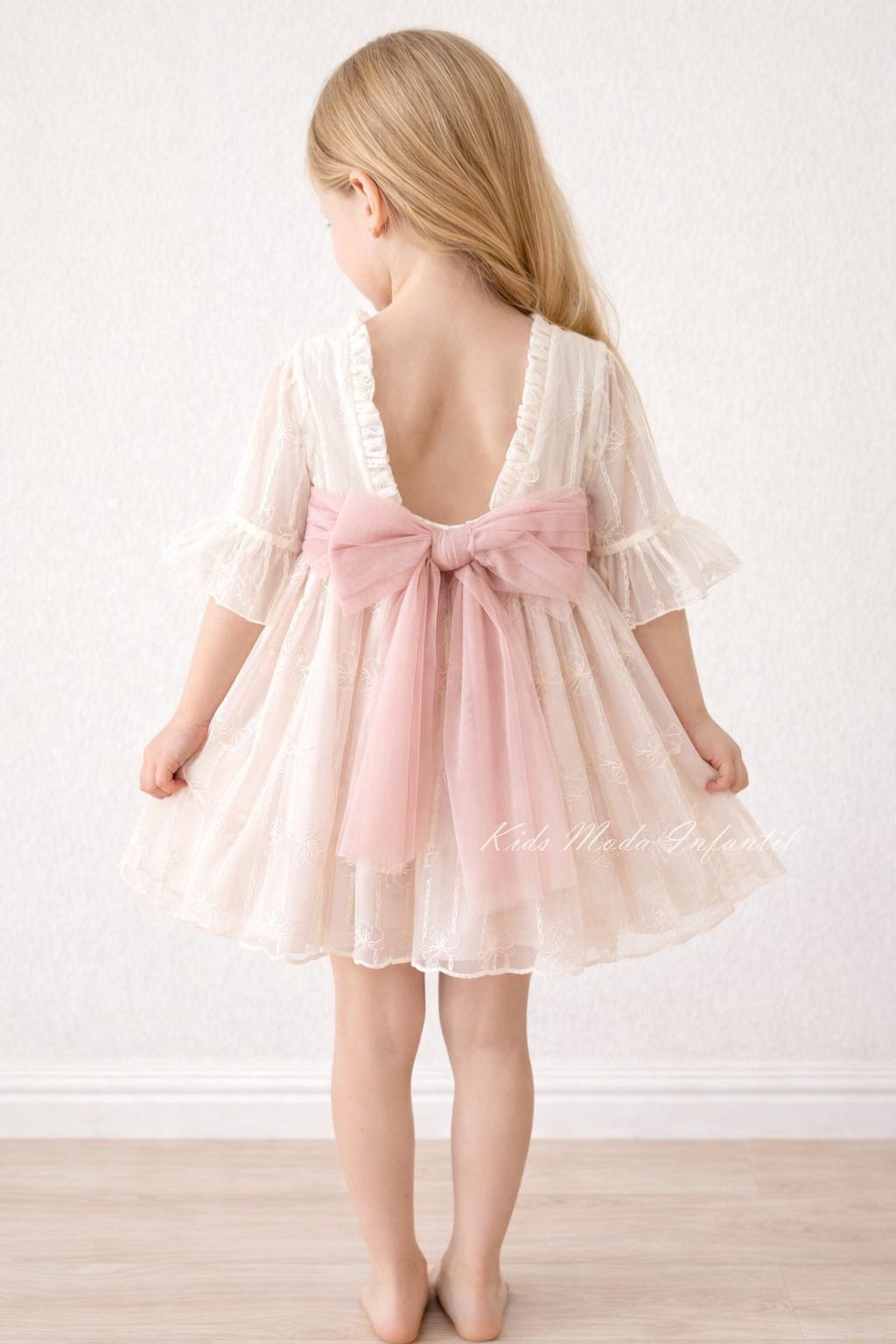 Vestido arras niña o vestido ceremonia niña en un estilo elegante y divino, confeccionado con esmero y cuidado para que tu hija luzca preciosa en ese ceremonia especial. Este precioso vestido niña arras vestir, luce su cuerpo en tul beige con sutil dibujo bordado de media manga con volante. Su falda de talle alto medio es de gran vuelo,confeccionada en tul bordado beige con otra capa de tul interna en color rosa empolvado. La elegancia de este vestido arras para niñas luce un precioso fajín de tul rosa empolvado con gran lazada en espalda con hermoso escote bajo en "u" con precioso volante fruncido al filo de cuello y escote. Este vestido ceremonia para niñas es ideal para eventos y días especiales está confeccionado en un tul bordado beige y tul rosa empolvado Primavera-Verano de gran caída y con una falda en talle medio alto de gran vuelo. Lleva braga a juego hasta talla 4 años largura CBG. COLECCIÓN IVANA EVA MARTÍNEZ ARTESANÍA.