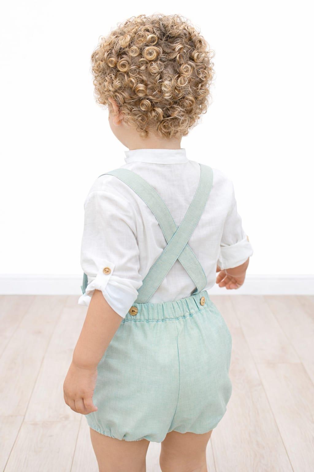 Perfecto conjunto niño vestir ceremonia confeccionado en dos prendas, camisa lino blanco roto de cuello mao, con botonadura madera delantera; combinando precioso peto con tirantes con pantalon bombacho en tejido lino verde agua perfecto e ideal para combinar con los preciosos vestidos niña arras y ceremonias especiales.