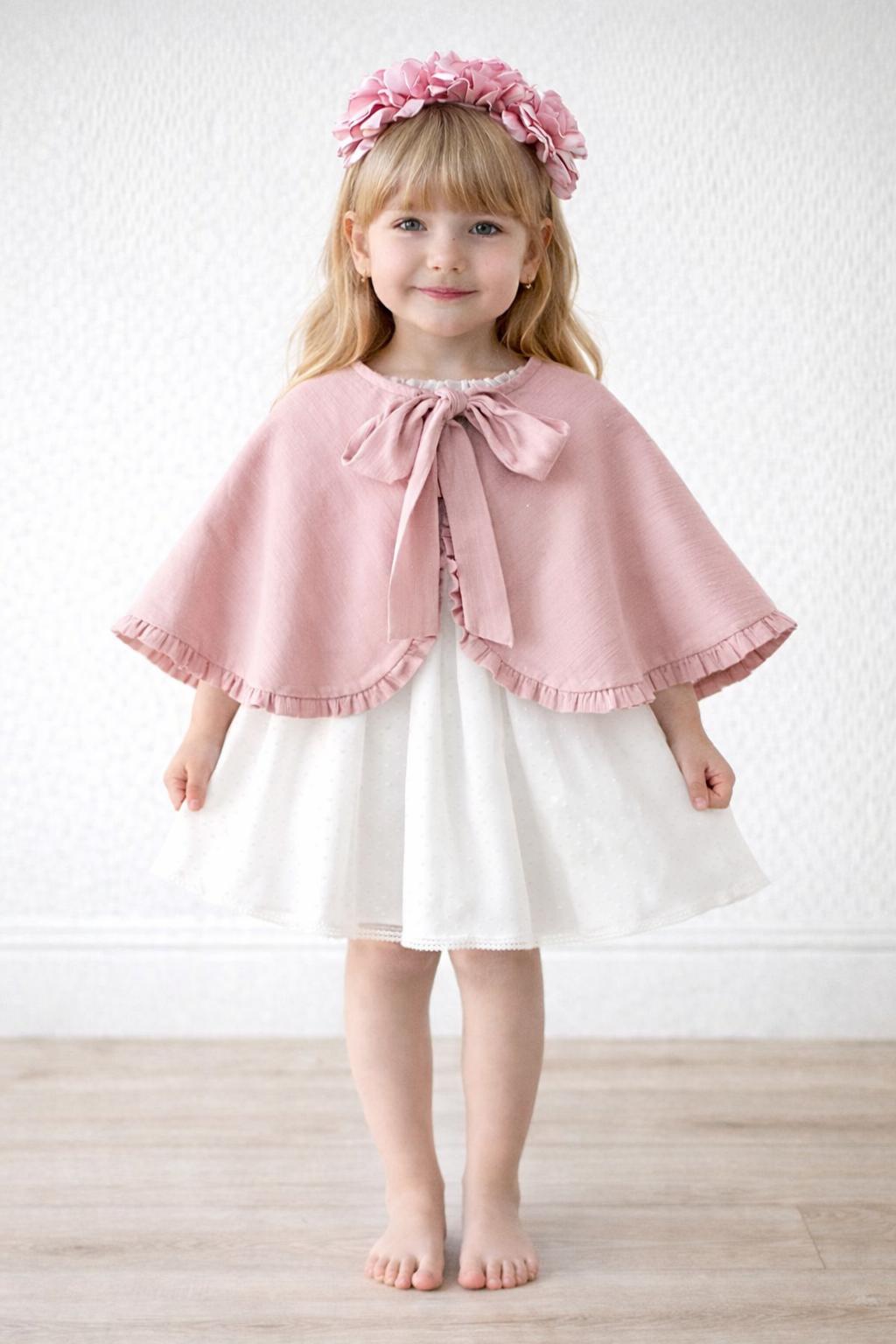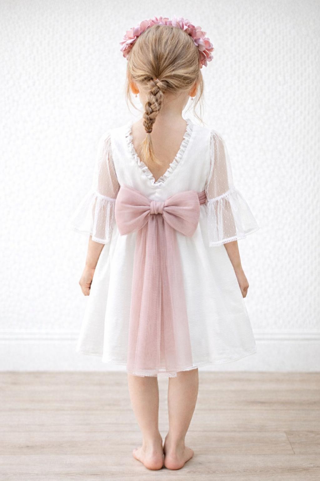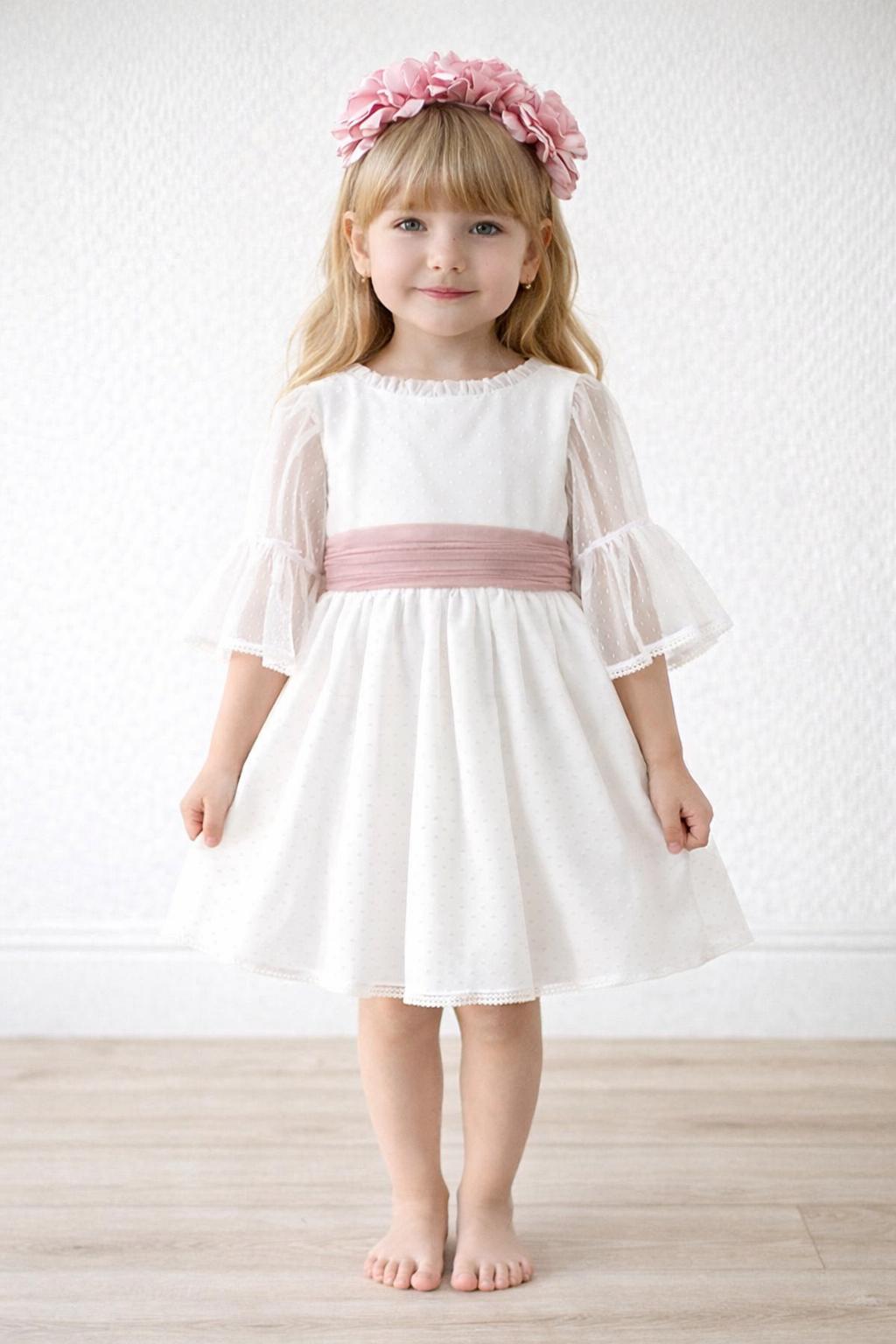 Precioso vestido ceremonia para niñas y arras confeccionado en un precioso tul de topo blanco roto en la parte del cuerpo, mangas y su falda de vuelo confeccionado en el mismo tejido de tul. Te fascinará su fajín con preciosa lazada para hacer rosa empolvado y el precioso escote a pico, además luce preciosa media manga con preciosa puntilla calada y bordada al tono.