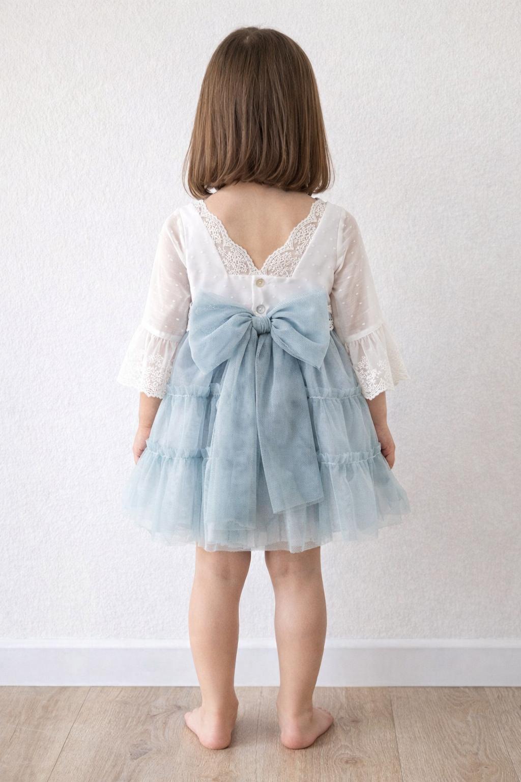 Vestido ceremonia niña media manga lino blanco y tul verde agua Basmarti 25252