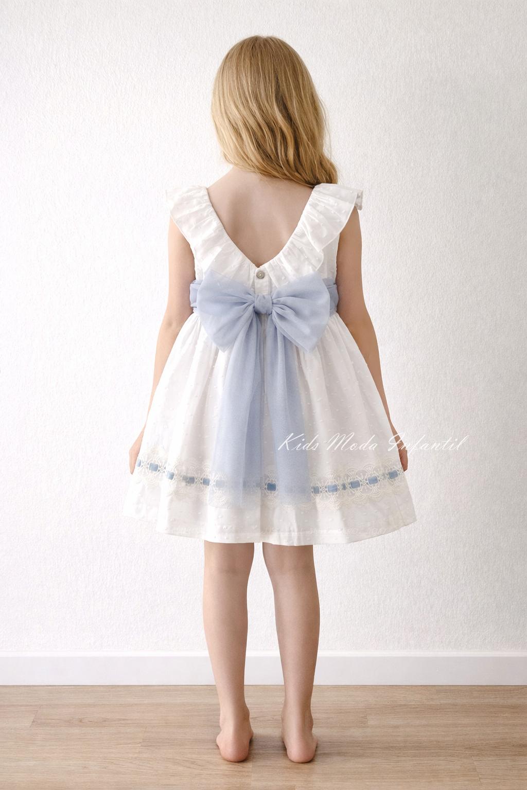 Vestido ceremonia niña plumeti blanco y tul azul empolvado Basmarti 25131