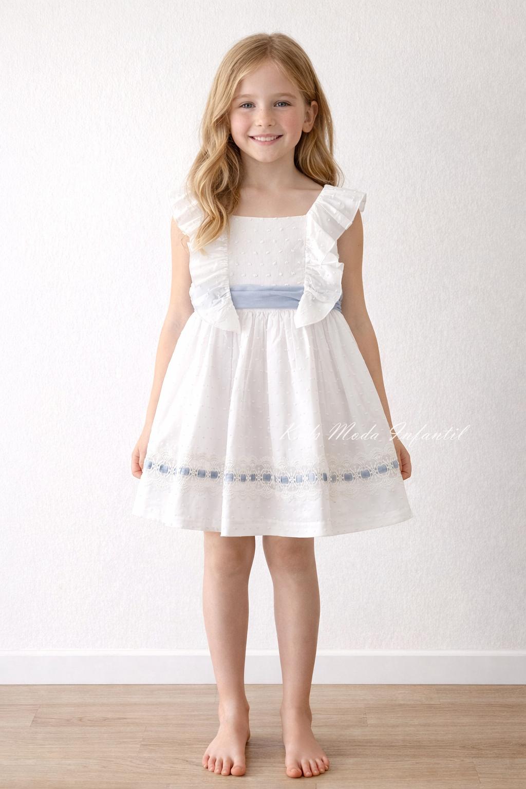 Precioso vestido ceremonia niña de talle alto con falda de vuelo, con cuerpo en un precioso tejido plumeti blanco con volantes desde costados y sobre hombros en mismo tejido, sin mangas, con cuello cuadrado, con bonito fajín de tul azul empolvado con lazada hecha en espalda (ver foto); Luce preciosa falda de vuelo confeccionada en tejido plumeti blanco con una bonita tira de tul bordada pasa cinta con tul azul empolvado entre lazada. Este precioso vestido arras niña tiene un precioso escote bajo a pico en la espalda con volante al filo. Este vestido ceremonia niña es ideal para cualquier evento especial de esta primavera verano. Basmarti Moda Infantil Colección Juana de Arco.