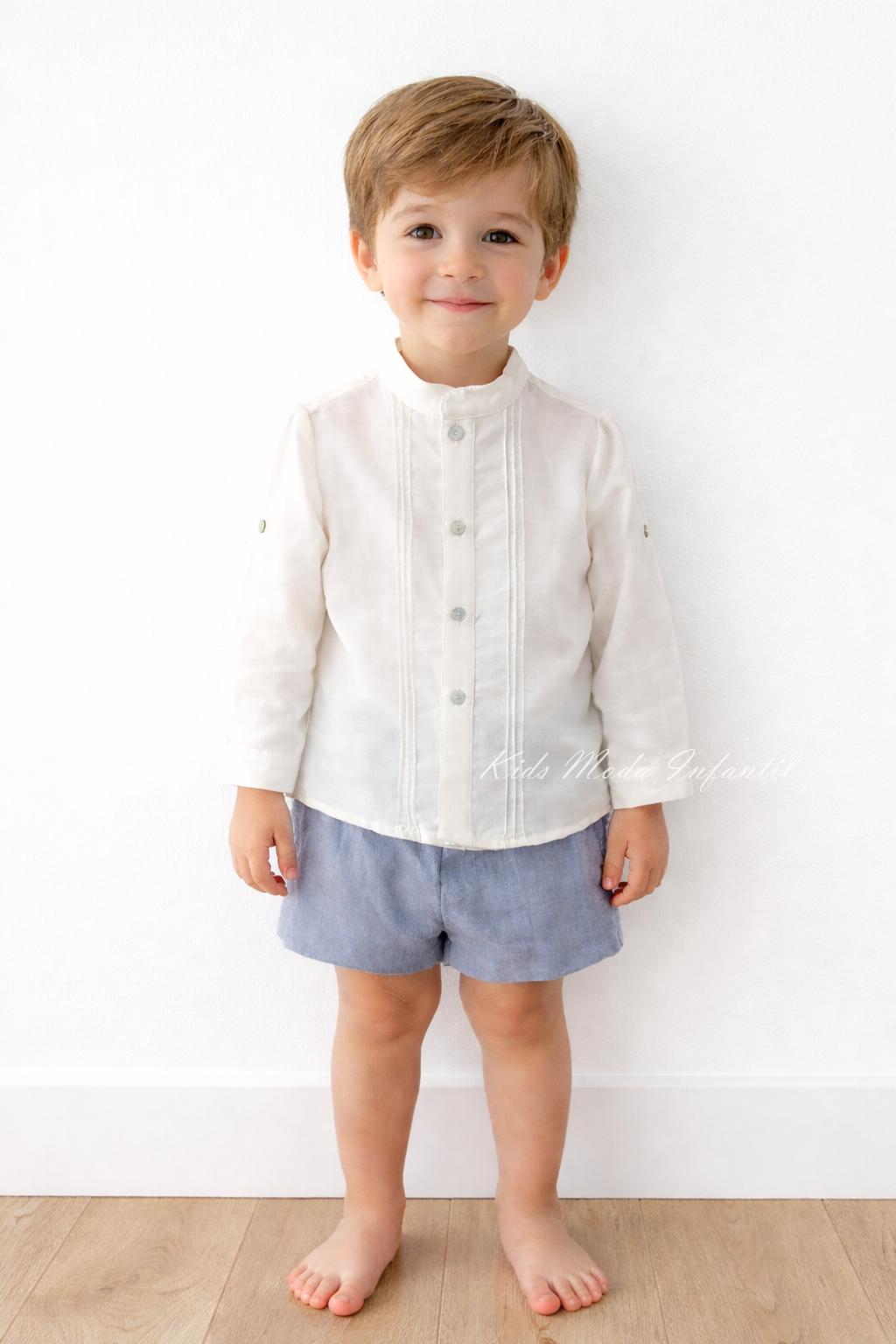 Conjunto ceremonia y arras para niño con camisa lino blanco roto con botonadura delantera, jaretas delanteras y botones anacarados, cuello Mao y a juego bermuda de lino azul empolvado. Precioso conjunto niño arras y ceremonia de camisa manga larga, pantalón corto bermuda.