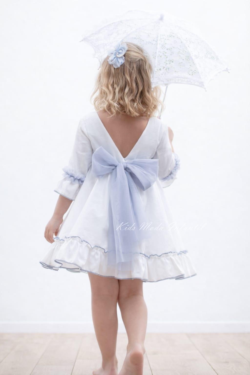 Vestido ceremonia niña blanco con fajin tul azul empolvado Nekenia 2521804