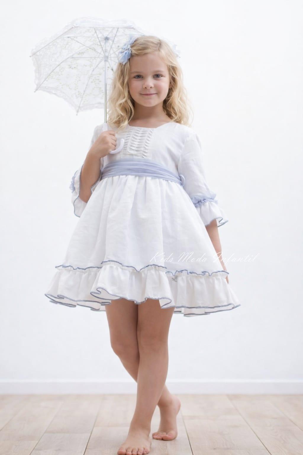 Vestido arras niña blanco o vestido ceremonia blanco niña en un estilo perfecto e ideal, realizado con cariño y cuidado para que tu niña luzca preciosa en ese ceremonia especial. Este precioso vestido niña ceremonia vestir, luce cuerpo entallado con bonita pechera enjaretadas, confeccionado en precioso tejido lino blanco roto, en media manga con bonita terminación bordada en hilo azul empolvado y un bonito fruncido de tul azul empolvado. Su falda de gran vuelo también confeccionada en mismo tejido lino con un bonito volante con terminación azul empolvado. Luce fajín en bonito tul azul empolvado con lazada para hacer en este vestido arras para niña. Espectacular escote a pico bajo. La elegancia de este vestido ceremonia para niñas es ideal para acompañamiento de boda o ceremonia especial. Este vestido ceremonia para niñas es ideal para eventos y días especiales está confeccionado en lino blanco Primavera-Verano de gran caída y falda de vuelo. COLECCION MAITE NEKENIA.