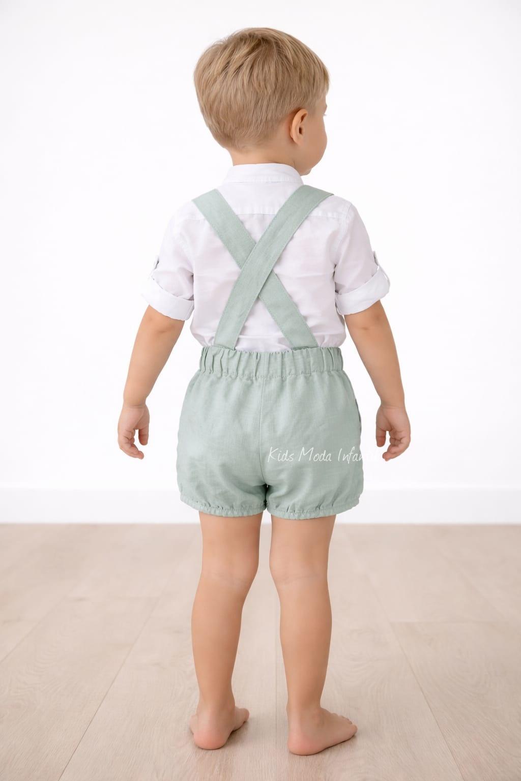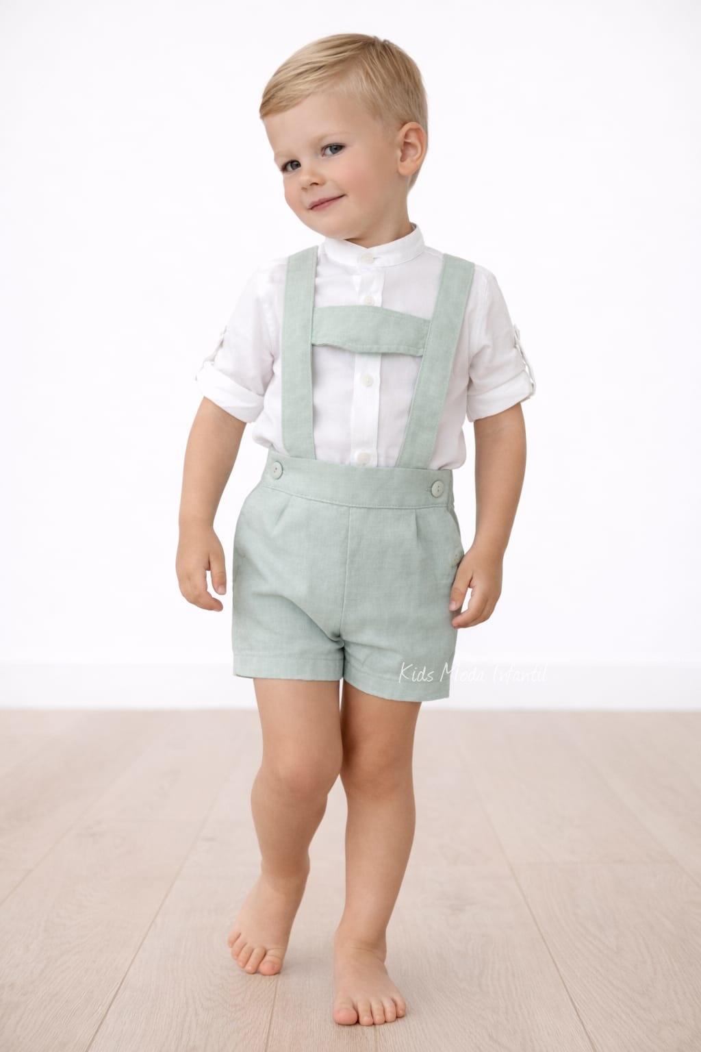 Conjunto ceremonia niño lino blanco roto y peto verde agua Nekenia 2521501-2521109
