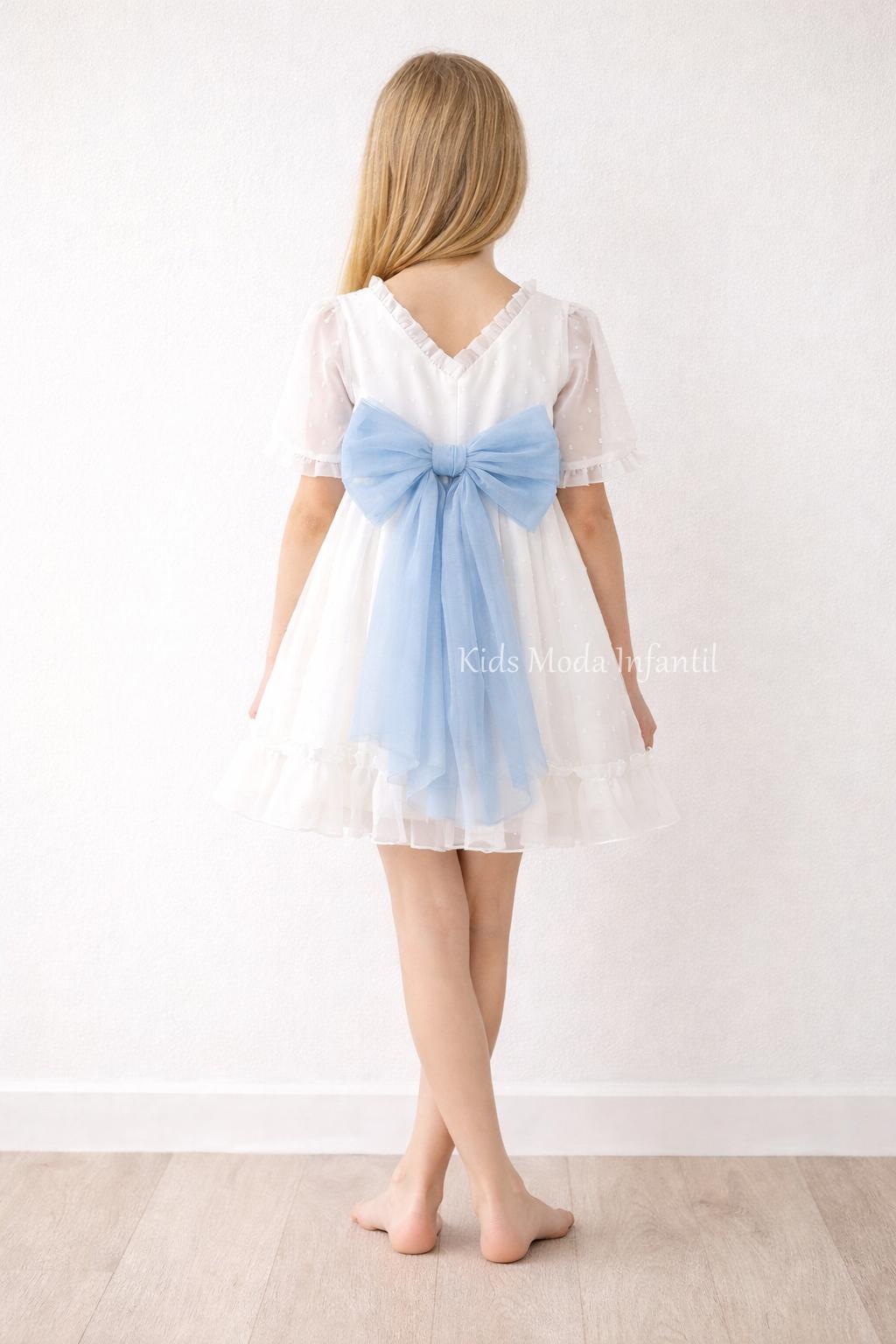 Vestido niña arras o vestido niña ceremonia en un estilo romántico y elegante, confeccionado con mucho mimo y cuidado para que tu princesa luzca ideal en un día tan especial. Este vestido de niña vestir ceremonia blanco roto luce cuerpo y falda en plumeti cristal blanco con detalle fruncido en mismo tejido en pequeño volante tanto en cuello como en manga además luce un volante inferior en todo el vuelo de la falda a la máxima perfección. Este precioso vestido niña ceremonia luce un precioso fajín de tul azul con una gran y bonita lazada en espalda bajo escote a pico bordeando el pequeño volante fruncido. Este vestido para niñas media manga de eventos especiales está confeccionado con un delicado tejido de Primavera-Verano de gran caída y con una falda en talle medio alto de gran vuelo. Desde talla 6 meses hasta 48 meses con largo cbg (con braguita), para tallas desde 5 a 16 años largo normal (sin braguita).