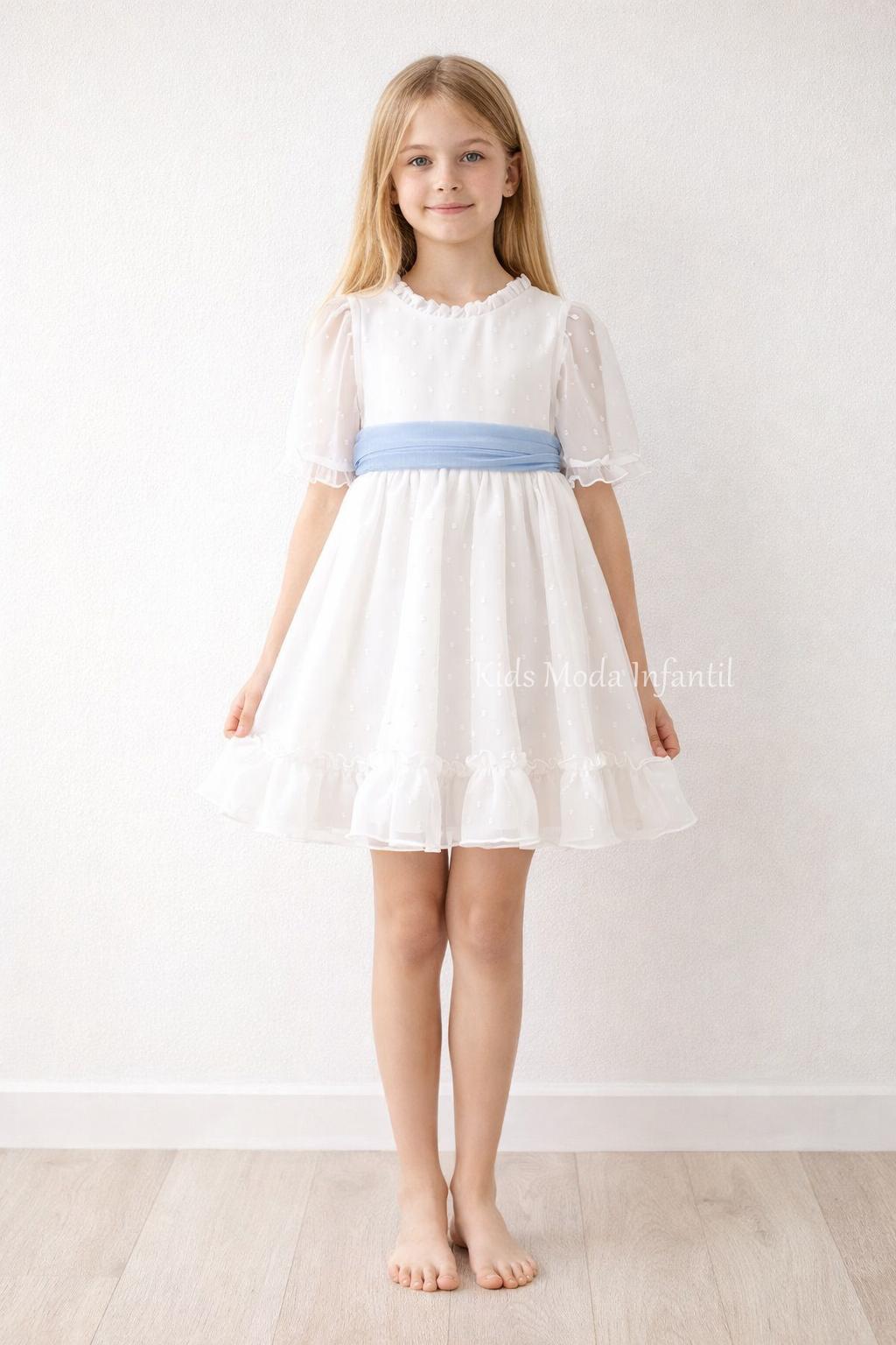 Vestido ceremonia niña plumeti cristal con fajín azul Eva Martínez Artesanía 32111