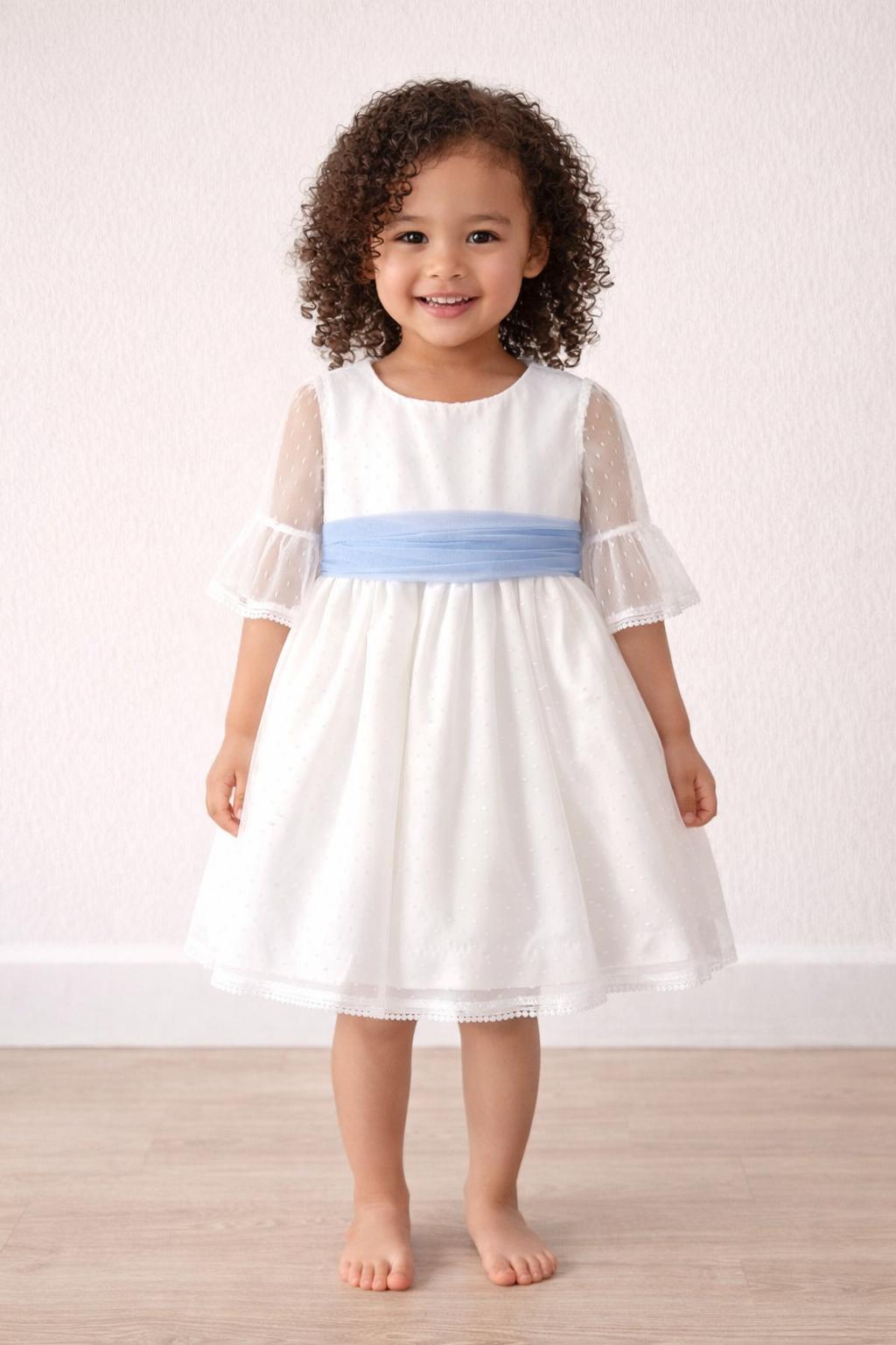Vestido ceremonia bebe niña o vestido arras bebe niña en un estilo precioso y elegante, confeccionado con mimo y cuidado para que tu niña luzca preciosa en ese ceremonia especial. Este precioso vestido niña ceremonia, luce su cuerpo de tul a topos blanco de media manga y cuello con volante fruncido al filo. Su falda de talle medio alto es de gran vuelo, confeccionado en tul de topos blanco. La elegancia de este vestido bebé niña vestir arras luce un precioso fajín de tul azul con gran lazada para hacer en espalda con hermoso escote a pico. Este vestido ceremonia bebe niña es ideal para eventos y días especiales está confeccionado en plumeti blanco combinado en tul rosa empolvado Primavera-Verano de gran caída y con una falda de vuelo. Lleva braguita a juego en todas sus tallas.