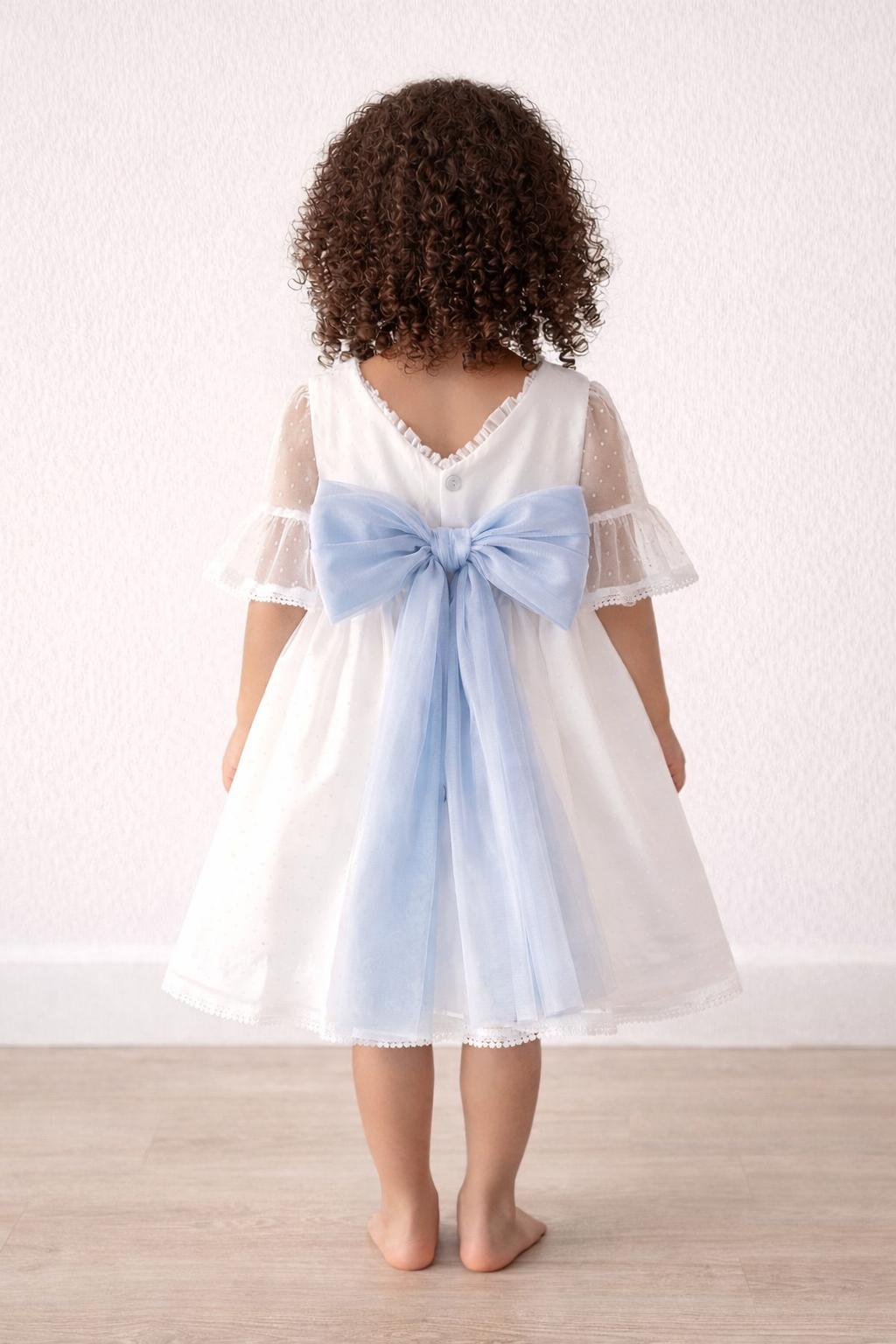VESTIDO CEREMONIA BEBE NIÑA TUL TOPOS Y FAJIN AZUL