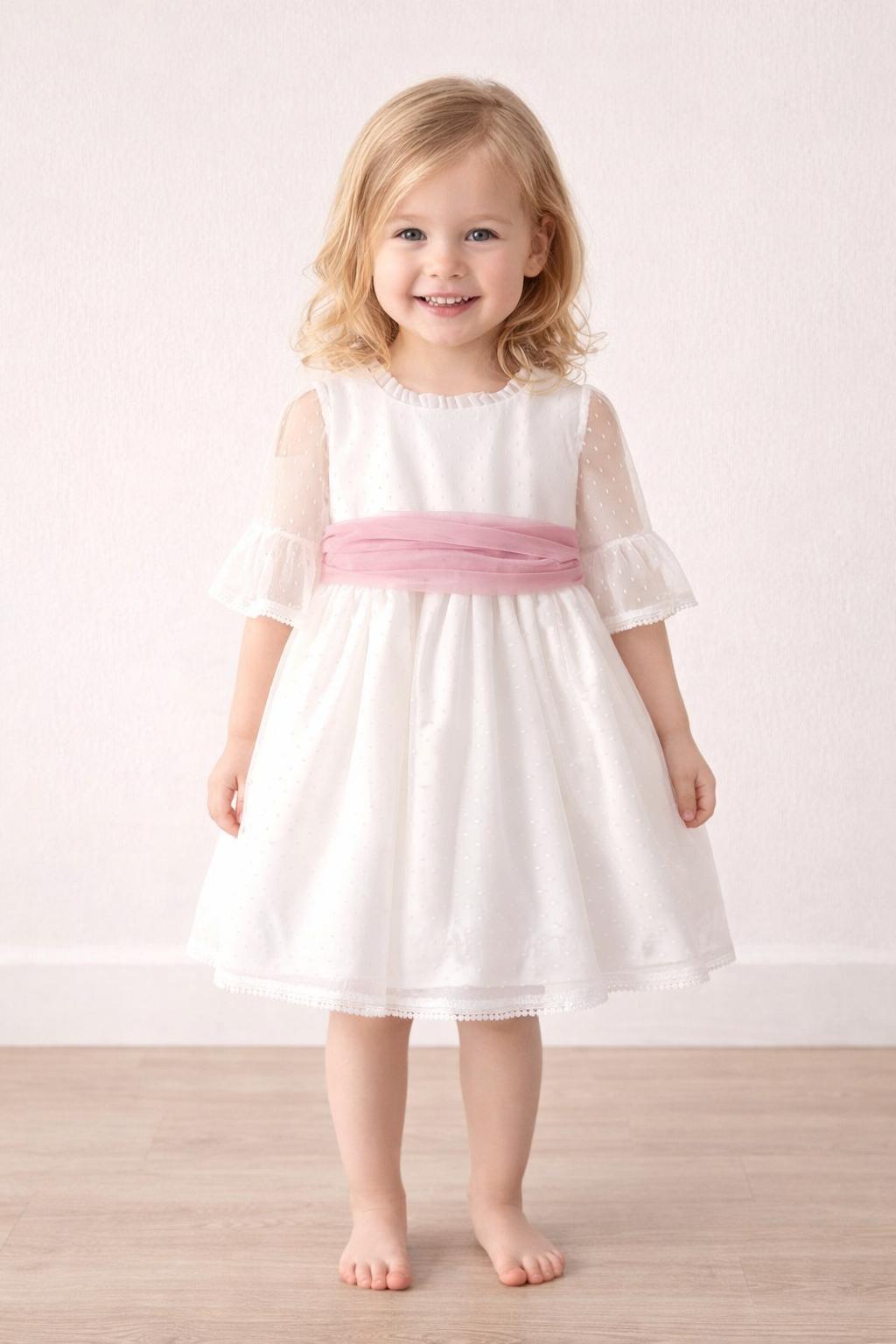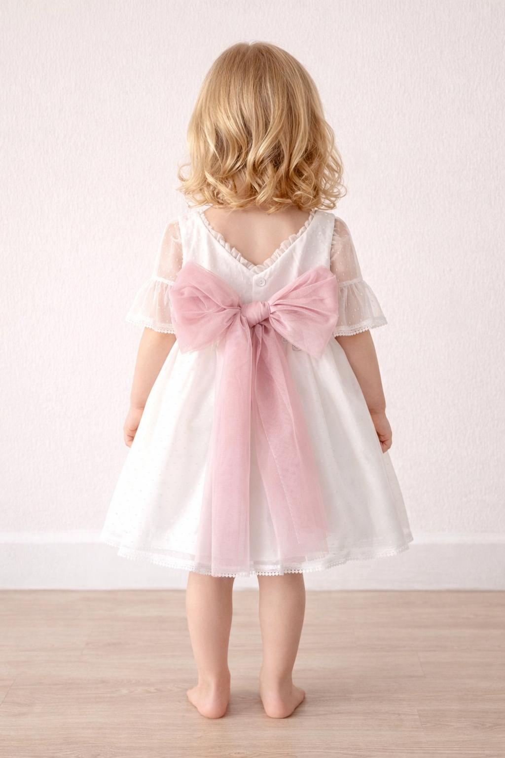 Vestido ceremonia bebe niña o vestido arras bebe niña en un estilo precioso y elegante, confeccionado con mimo y cuidado para que tu niña luzca preciosa en ese ceremonia especial. Este precioso vestido niña ceremonia, luce su cuerpo de tul a topos blanco de media manga y cuello con volante fruncido al filo. Su falda de talle medio alto es de gran vuelo, confeccionado en tul de topos blanco. La elegancia de este vestido bebé niña vestir arras luce un precioso fajín de tul rosa lila con gran lazada para hacer en espalda con hermoso escote a pico. Este vestido ceremonia bebe niña es ideal para eventos y días especiales está confeccionado en plumeti blanco combinado en tul rosa empolvado Primavera-Verano de gran caída y con una falda de vuelo. Lleva braguita a juego en todas sus tallas.