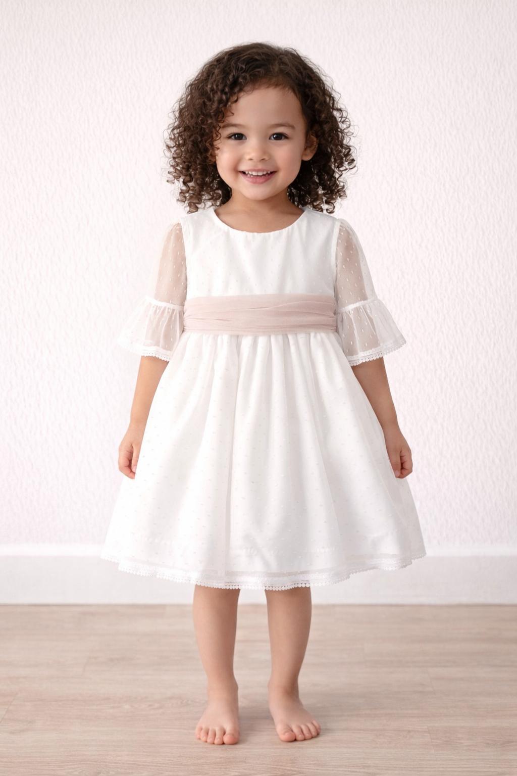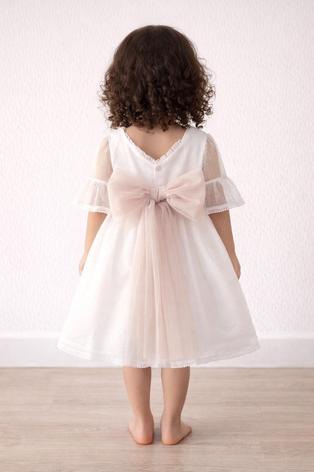 Vestido ceremonia bebe niña o vestido arras bebe niña en un estilo precioso y elegante, confeccionado con mimo y cuidado para que tu niña luzca preciosa en ese ceremonia especial. Este precioso vestido niña ceremonia, luce su cuerpo de tul a topos blanco de media manga y cuello con volante fruncido al filo. Su falda de talle medio alto es de gran vuelo, confeccionado en tul de topos blanco. La elegancia de este vestido bebé niña vestir arras luce un precioso fajín de tul camel con gran lazada para hacer en espalda con hermoso escote a pico. Este vestido ceremonia bebe niña es ideal para eventos y días especiales está confeccionado en plumeti blanco combinado en tul rosa empolvado Primavera-Verano de gran caída y con una falda de vuelo. Lleva braguita a juego en todas sus tallas.