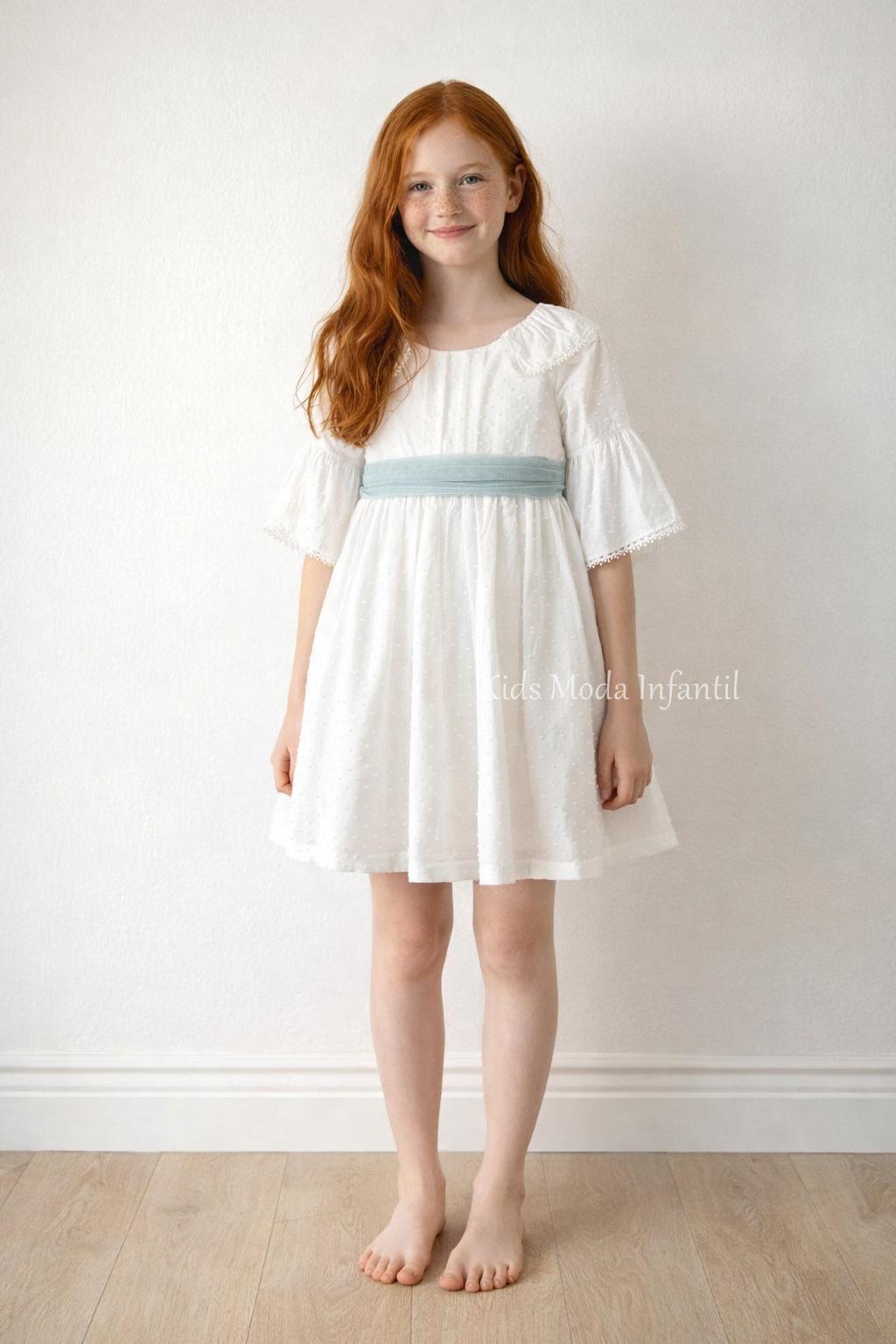 Vestido ceremonia niña o vestido arras niña en un estilo precioso y elegante, confeccionado con mimo y cuidado para que tu niña luzca preciosa en ese ceremonia especial. Este precioso vestido niña ceremonia, luce su cuerpo en plumeti blanco de media manga con puntilla al filo tanto en manga como en su bonito cuello. Su falda de talle medio alto es de gran vuelo, confeccionado en un bonito tejido plumeti blanco. La elegancia de este vestido niña vestir arras luce un precioso fajín de tul verde empolvado con gran lazada para hacer en espalda con hermoso escote a pico. Este vestido ceremonia niña es ideal para eventos y días especiales está confeccionado en plumeti blanco combinado en tul verde empolvado Primavera-Verano de gran caída y con una falda de vuelo.