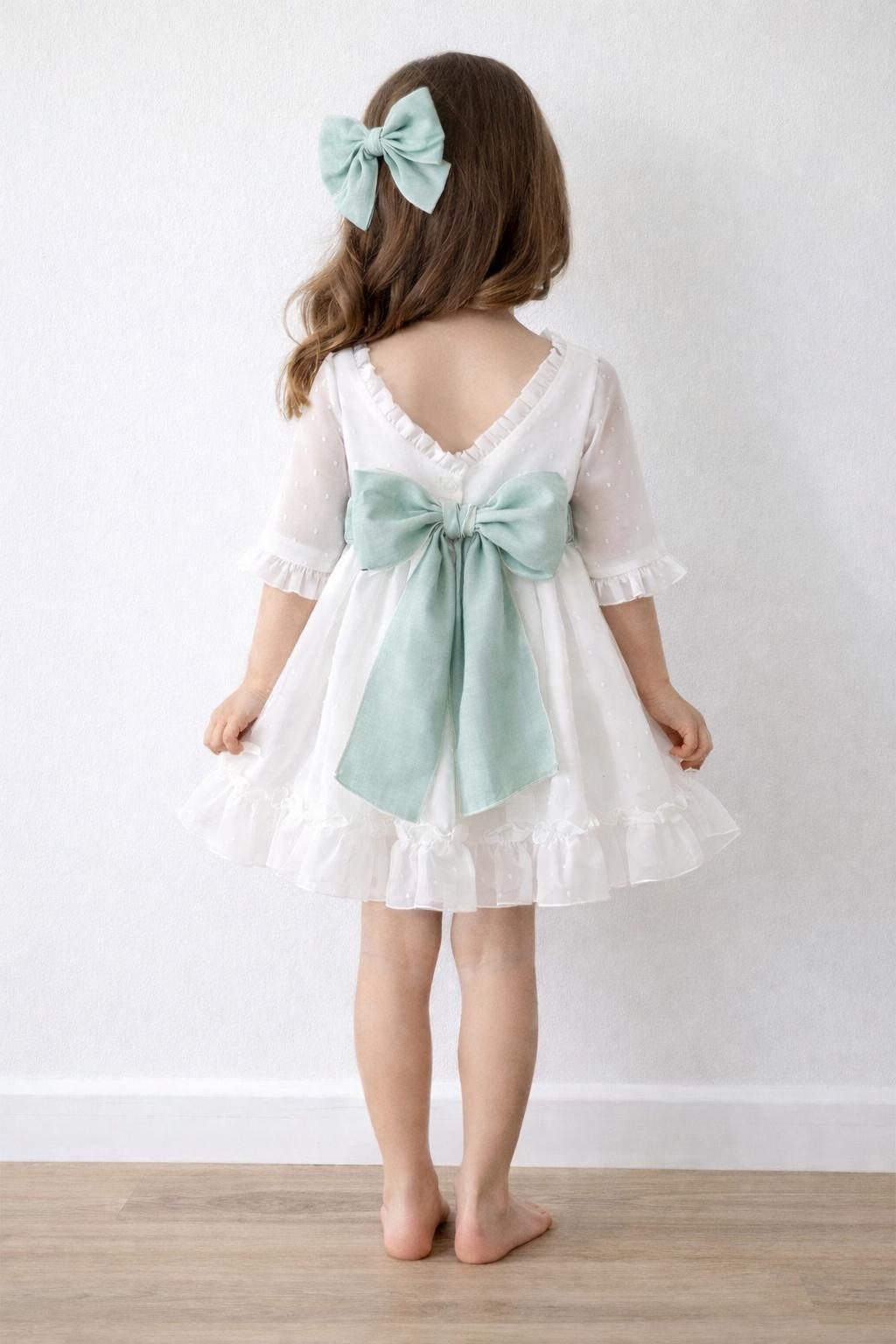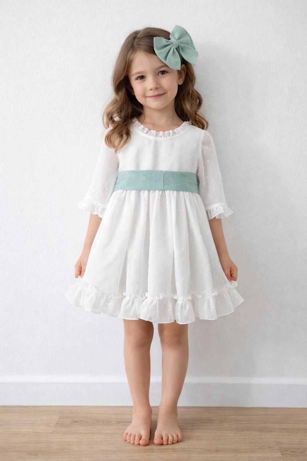 Vestido niña arras o vestido niña ceremonia en un estilo elegante, confeccionado con mimo y cuidado para que tu princesa luzca ideal en un día tan especial. Este vestido de niña ceremonia blanco roto luce cuerpo y falda en plumeti cristal blanco con detalle fruncido en mismo tejido en pequeño volante tanto en cuello como en manga además luce un volante inferior en todo el vuelo de la falda a la máxima perfección. Lleva braga a juego hasta talla 48 meses. Este precioso vestido niña ceremonia luce un precioso fajín lino verde empolvado con una gran y bonita lazada en espalda bajo escote a pico bordeando el pequeño volante fruncido. Este vestido para niñas media manga de eventos especiales está confeccionado con un delicado tejido de gran caída y con una falda en talle medio alto de gran vuelo. Desde talla 6 meses hasta 48 meses con largo cbg (con braguita), para tallas desde 5 a 16 años largo normal (sin braguita). (